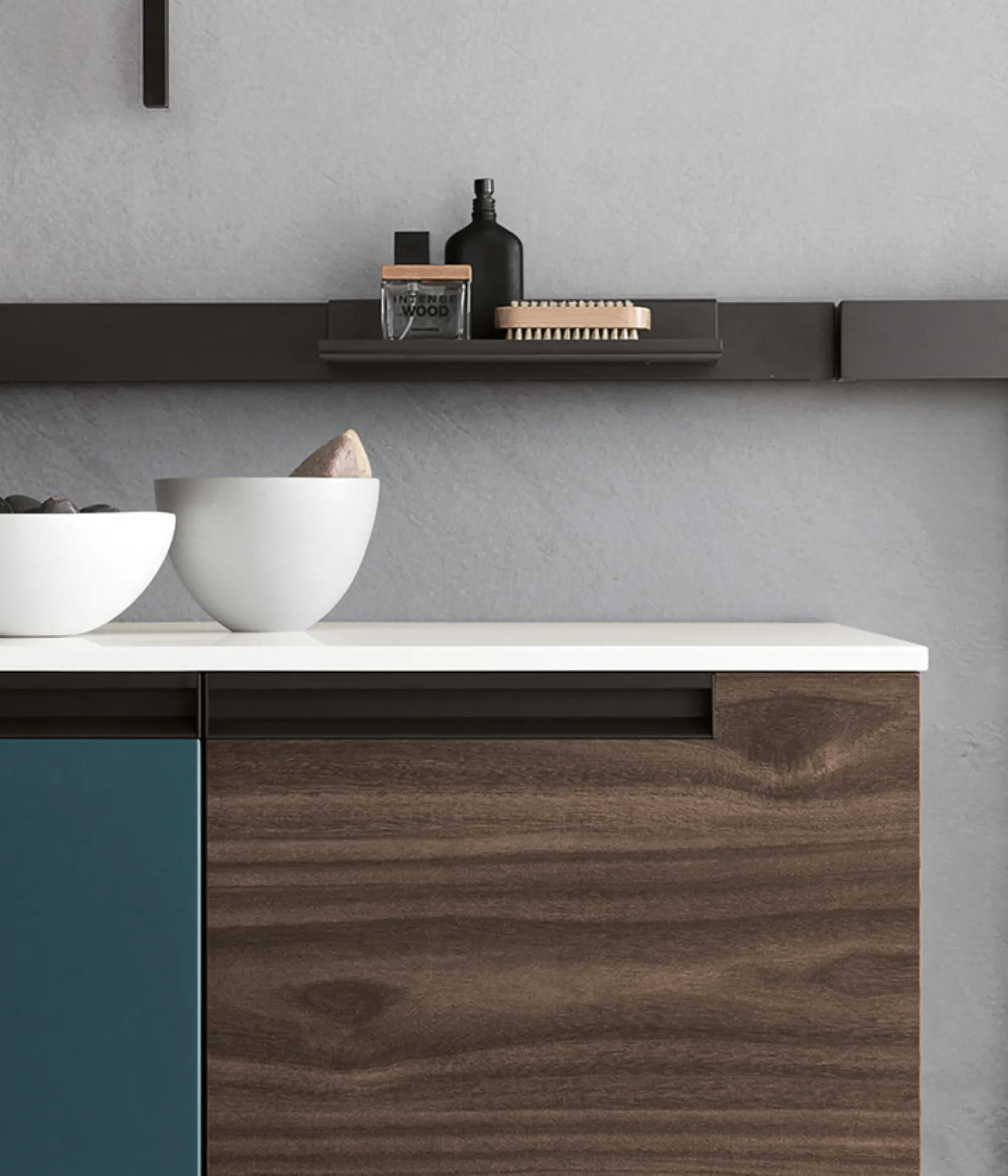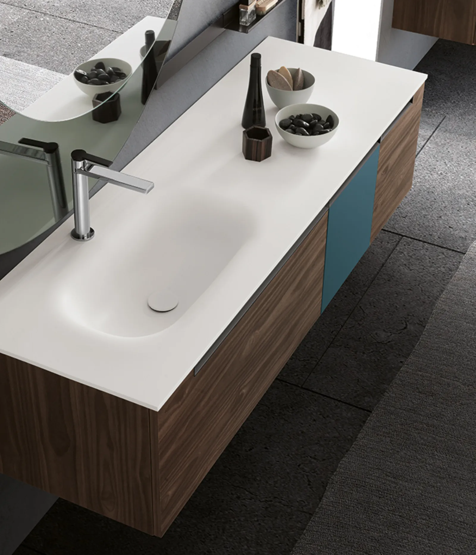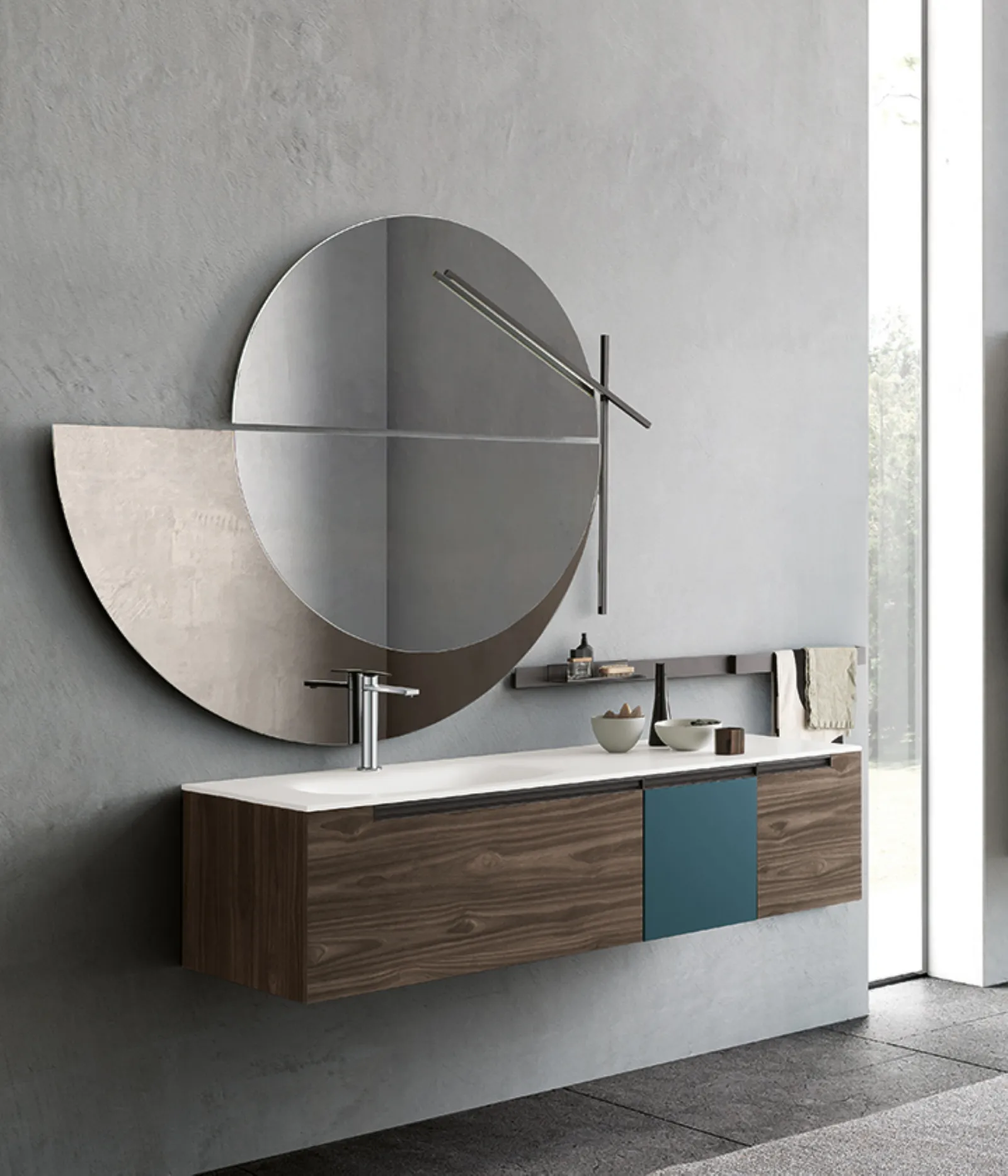 Bimelaminico minato e laccato petrolio opaco con maniglie titanio. Top corian con vasca integrata cn. Specchi Jupiter e Sputnik con lampada Compasso.