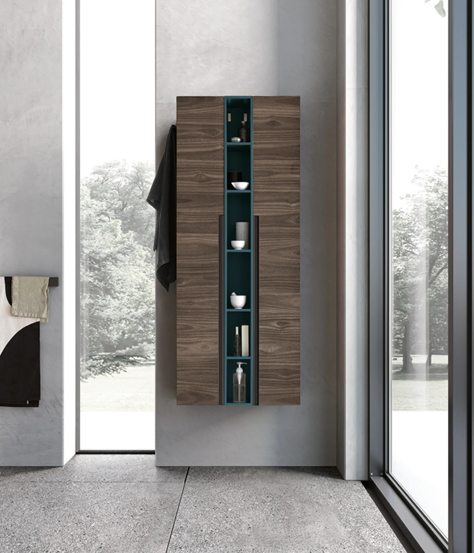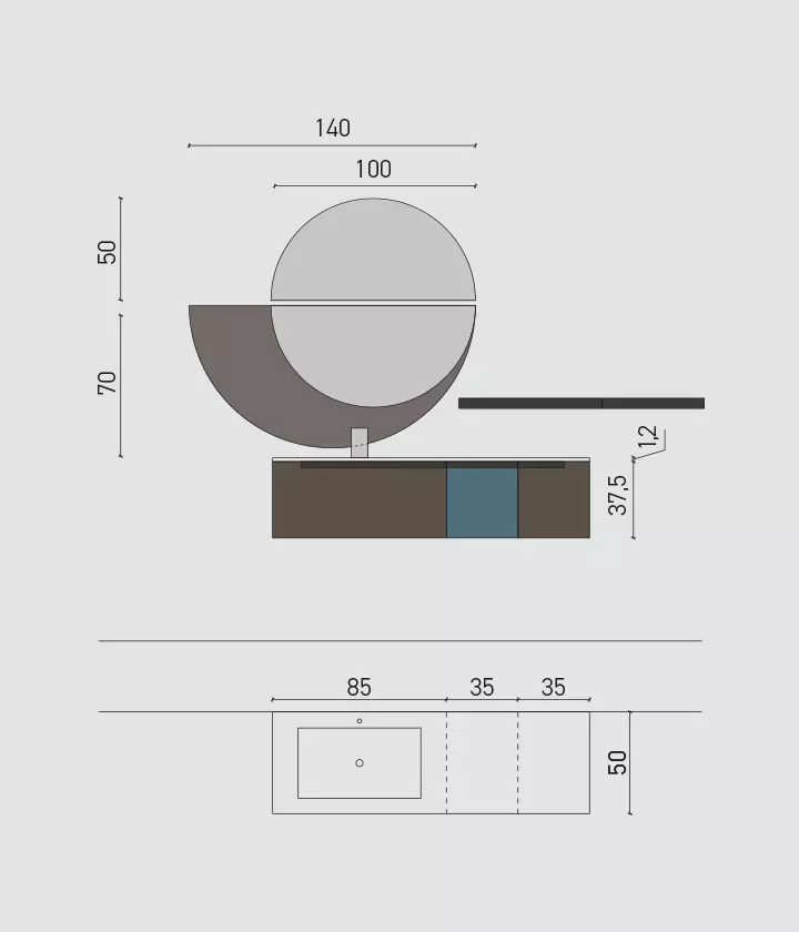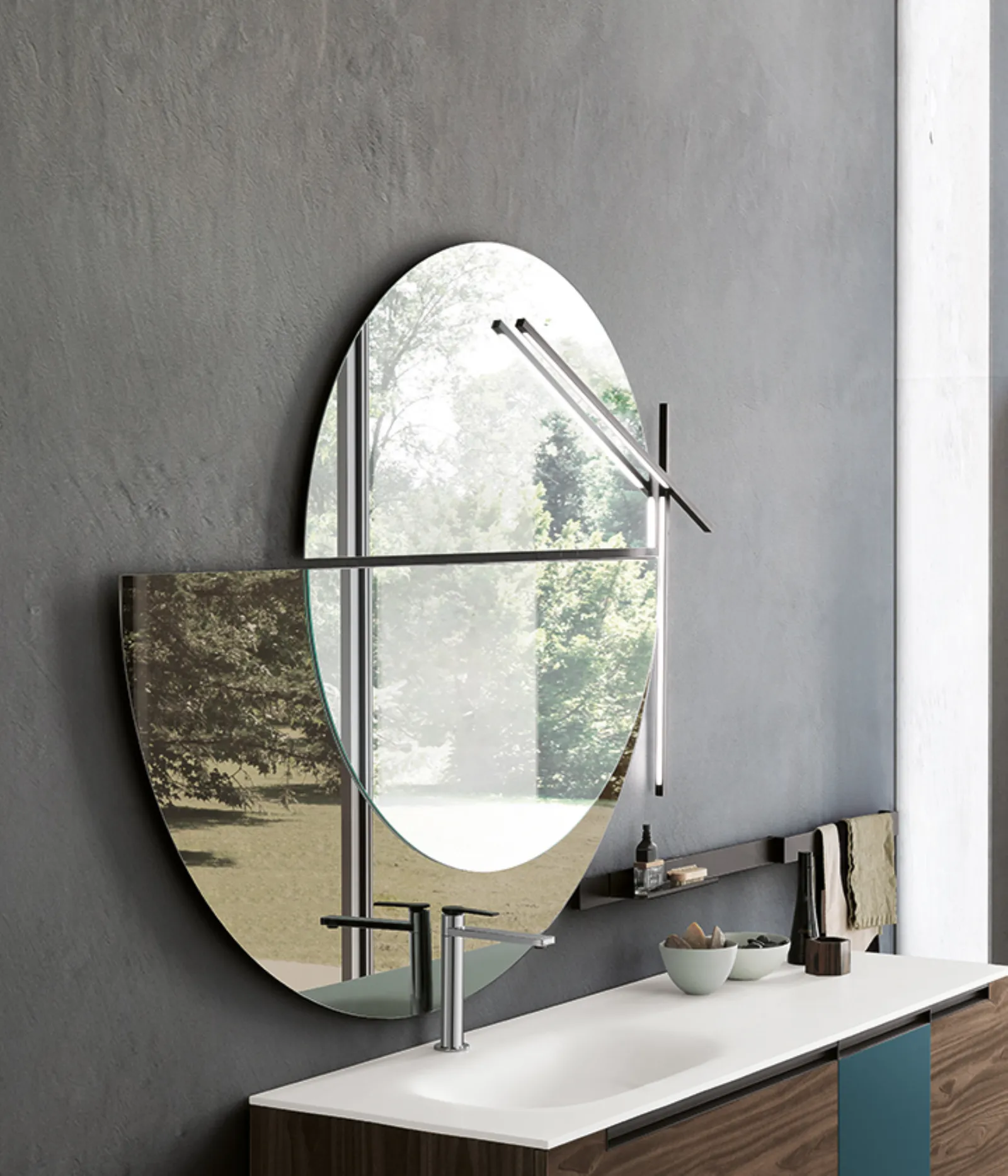 Bimelaminico minato e laccato petrolio opaco con maniglie titanio. Top corian con vasca integrata cn. Specchi Jupiter e Sputnik con lampada Compasso.
