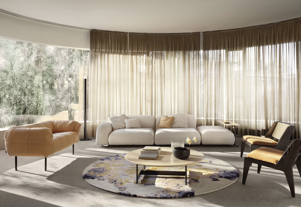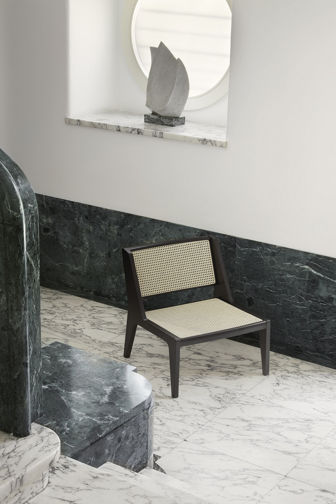 The Delta Vienna lounge chair is distinguished by the triangular, almost wing-like legs and the backrest sides. This distinctive silhouette, made from solid wood, contrasts with the seat and the backrest in “Paglia di Vienna” rattan.
