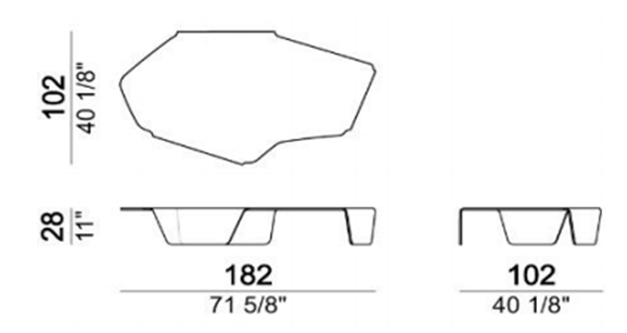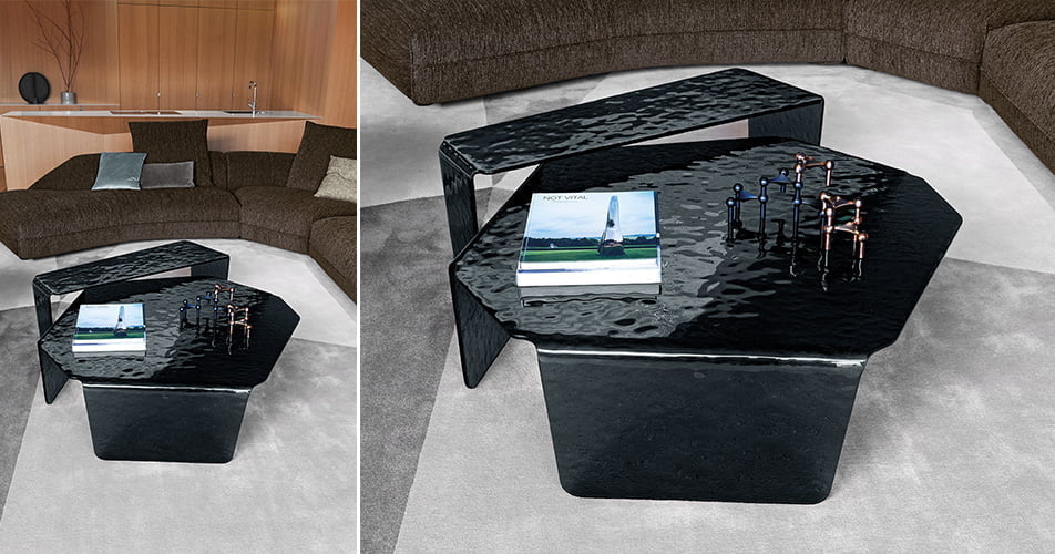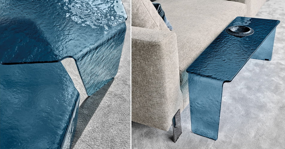 Realizzato in vetro curvato e martellato color fumé, il tavolino stupisce per le forme sinuose del piano che curva in tre punti strategici, abbracciando la struttura di sostegno. La speciale lavorazione del vetro dà vita a un gioco di luci che crea l'illusione di onde mosse dal vento.
