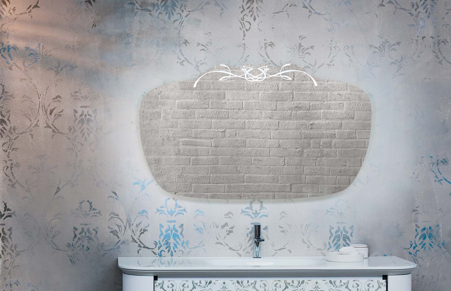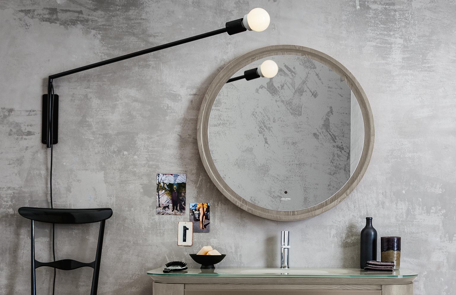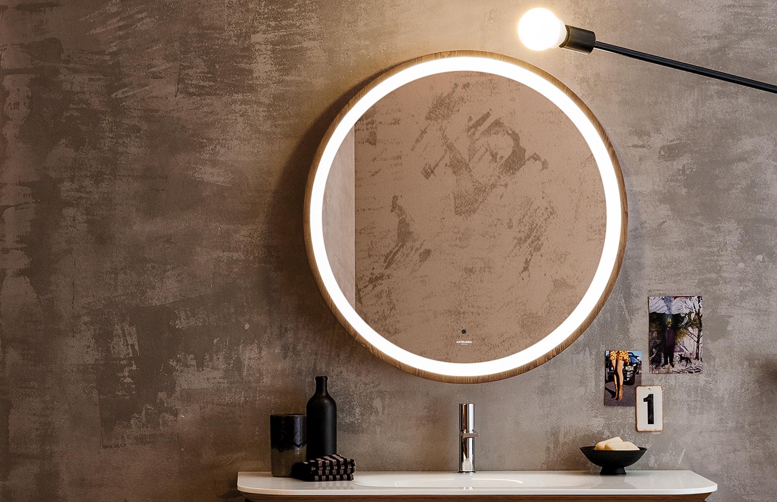 Specchio 5 mm bordo filo lucido con cornice in FRASSINO laccato finitura Cotone, Canapa, China o NOCE CANALETTO NATURALE. Illuminazione perimetrale frontale a led, trasformatore 220/12V ed interruttore sensor frontale. Completo di telaio.