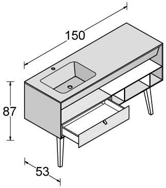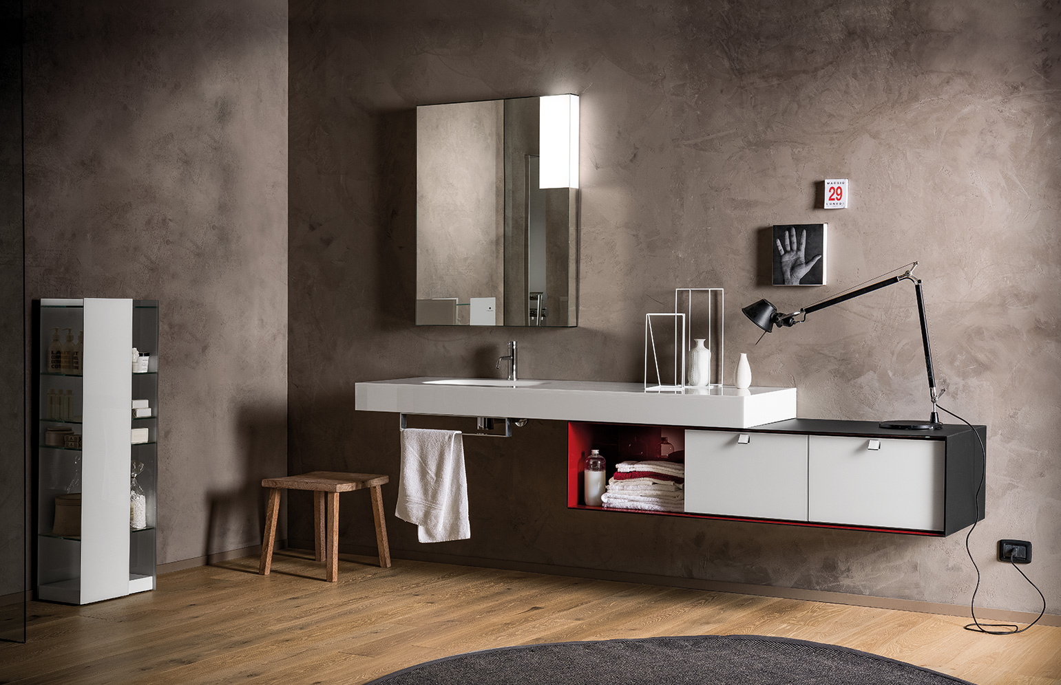 La razionalità del disegno del monoblocco è sdrammatizzata sia dalla componibilità interna data dai cassetti e dai vani a giorno, posizionabili liberamente all’interno dello spazio, sia dalla possibilità di abbinare colori diversi, grazie a Dualite.