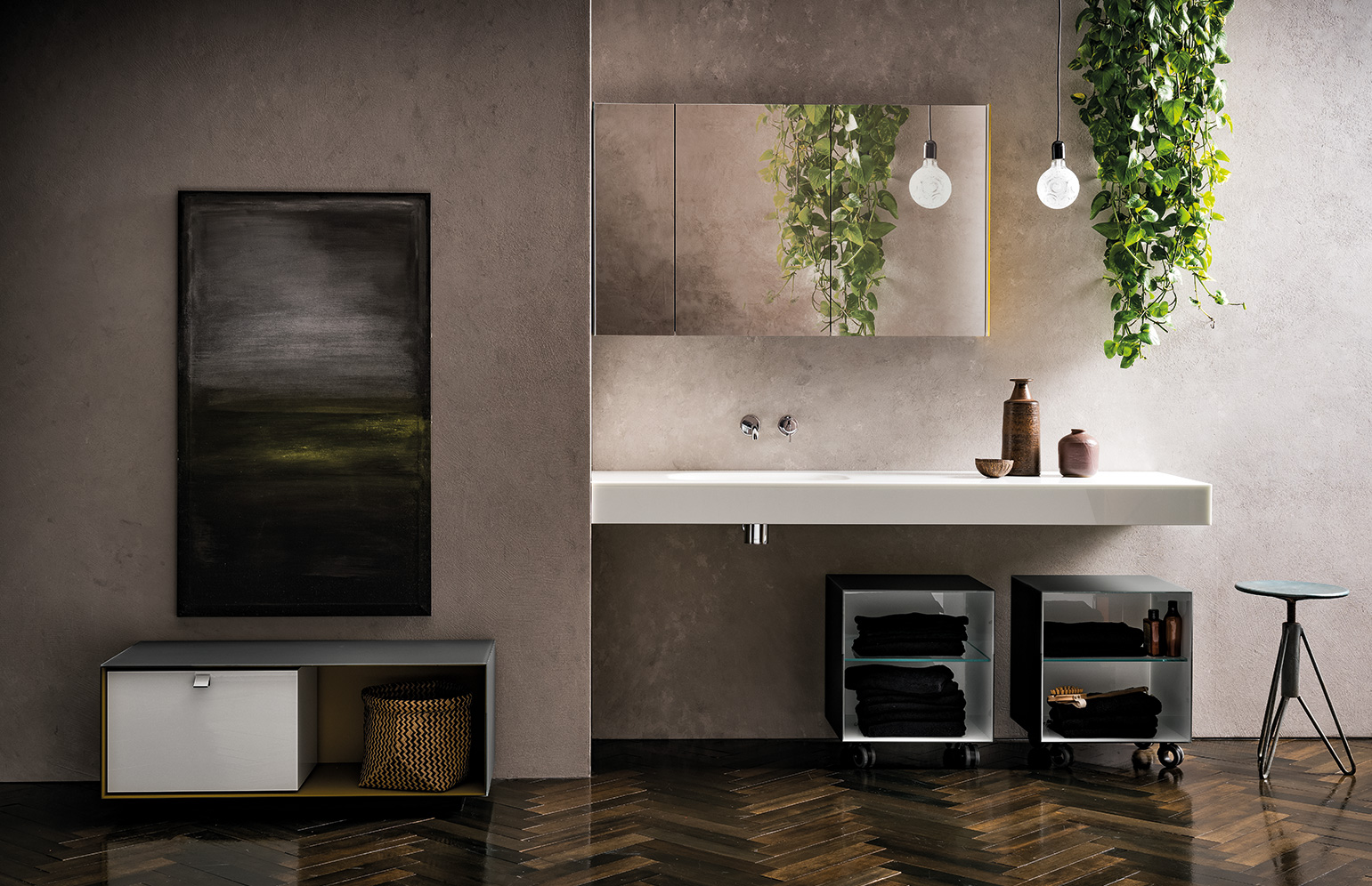 La razionalità del disegno del monoblocco è sdrammatizzata sia dalla componibilità interna data dai cassetti e dai vani a giorno, posizionabili liberamente all’interno dello spazio, sia dalla possibilità di abbinare colori diversi, grazie a Dualite.