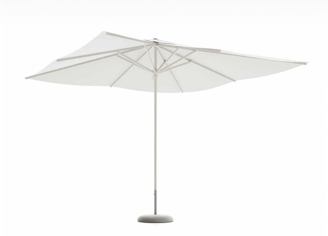 Telaio in alluminio verniciato grigio o bianco. Tessuto acrilico gr. 320 in colore bianco o ecrù. Completo di soffietto antivento, apertura a carrucola, corone in resina.