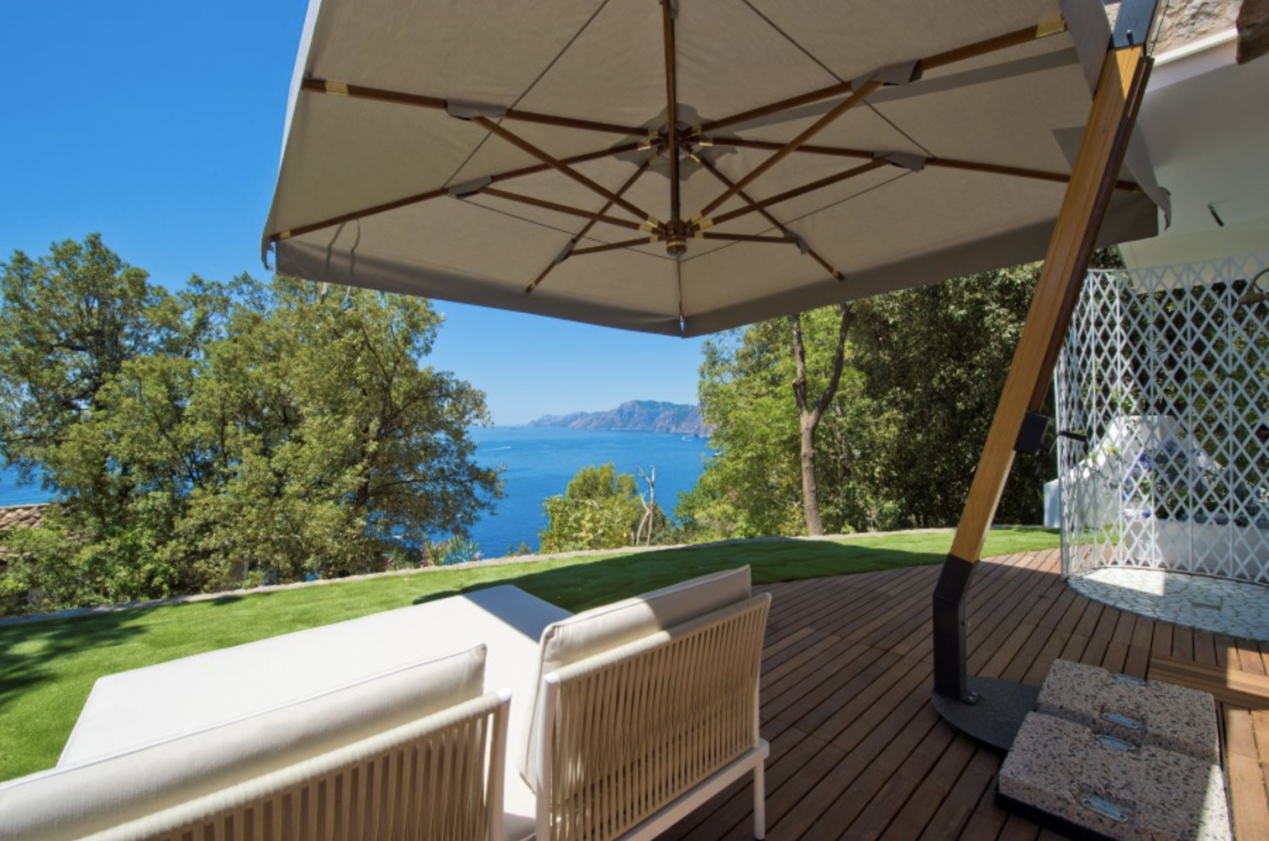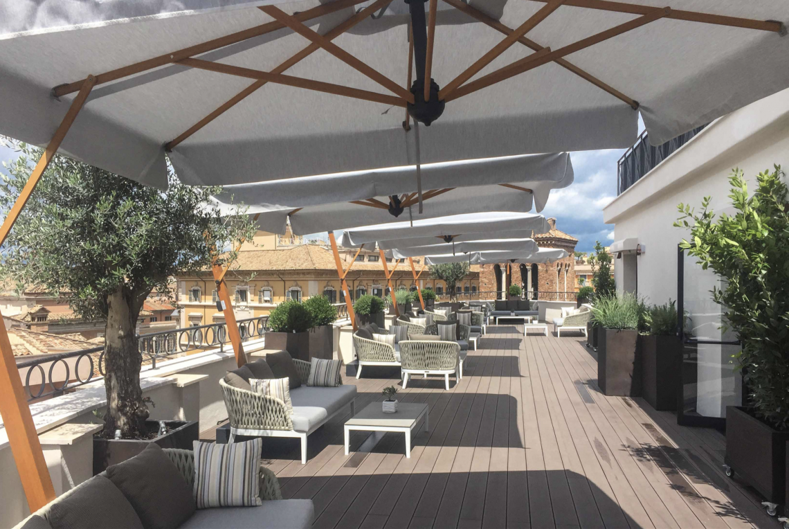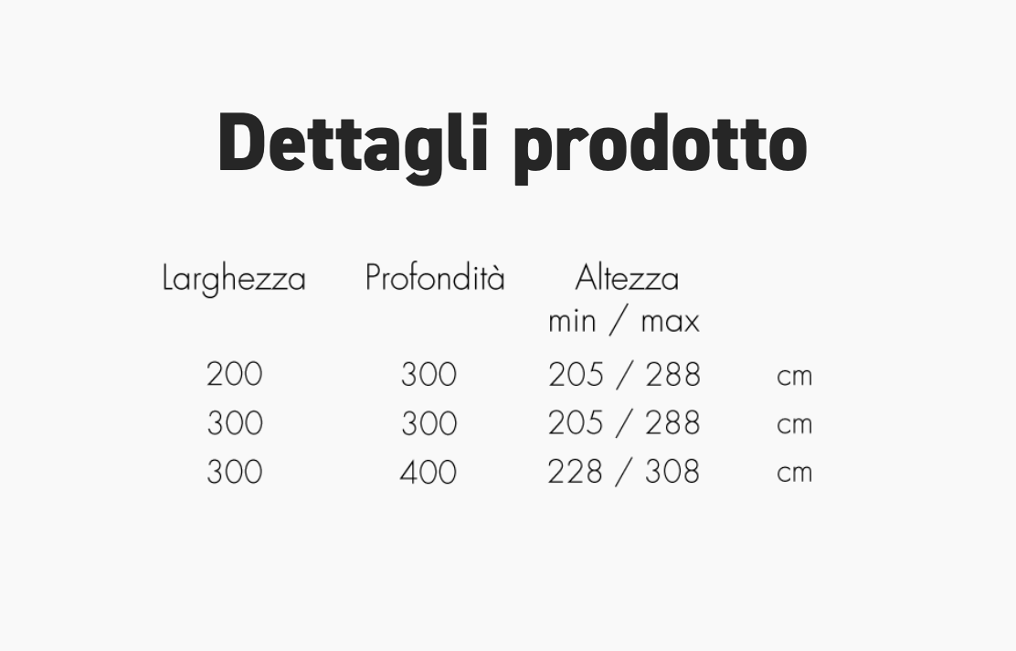 Palo verticale in legno di iroko. Palo orizzontale in alluminio grigio. Componenti in acciaio zincato e verniciato. Tessuto acrilico gr. 320 in colore bianco.