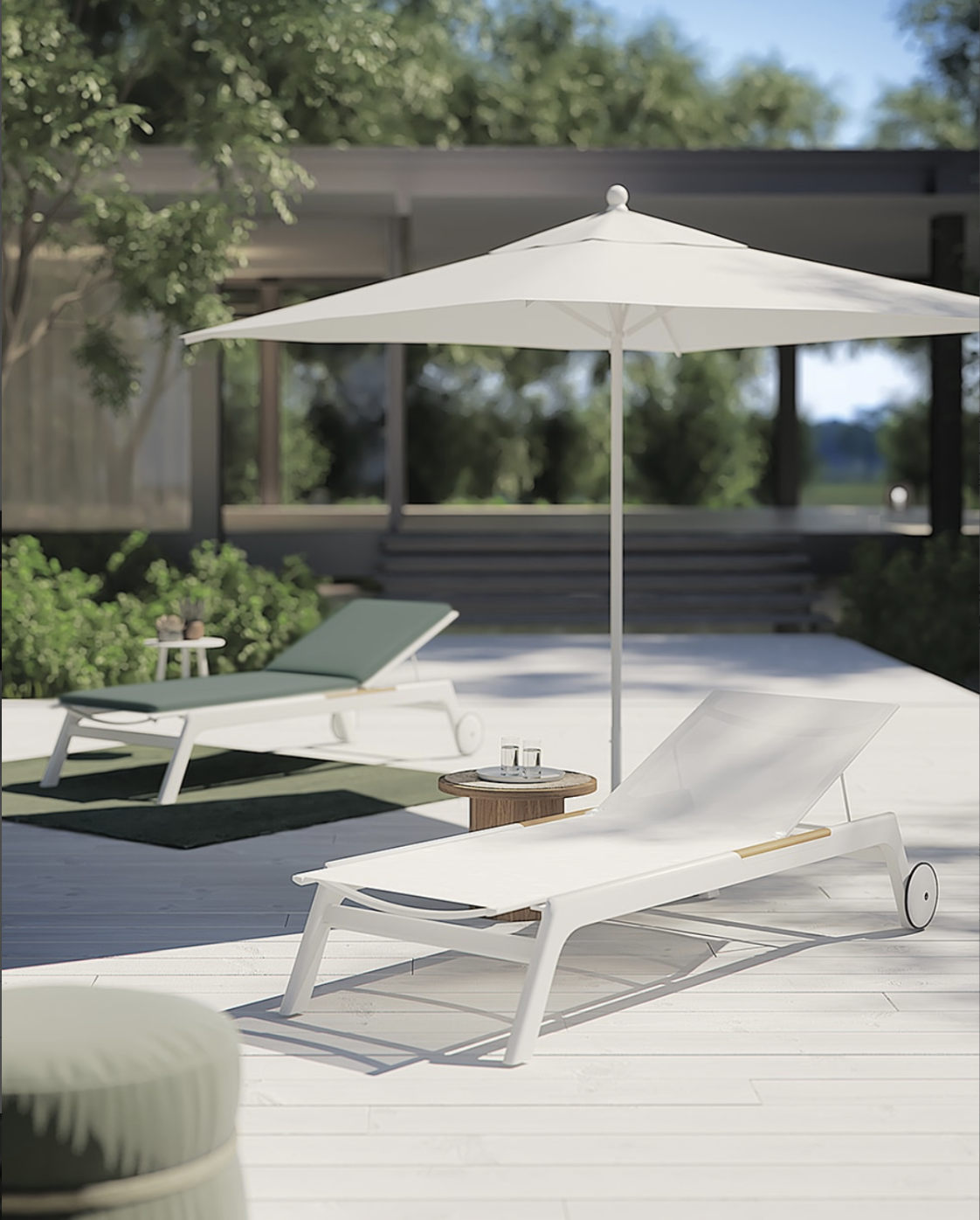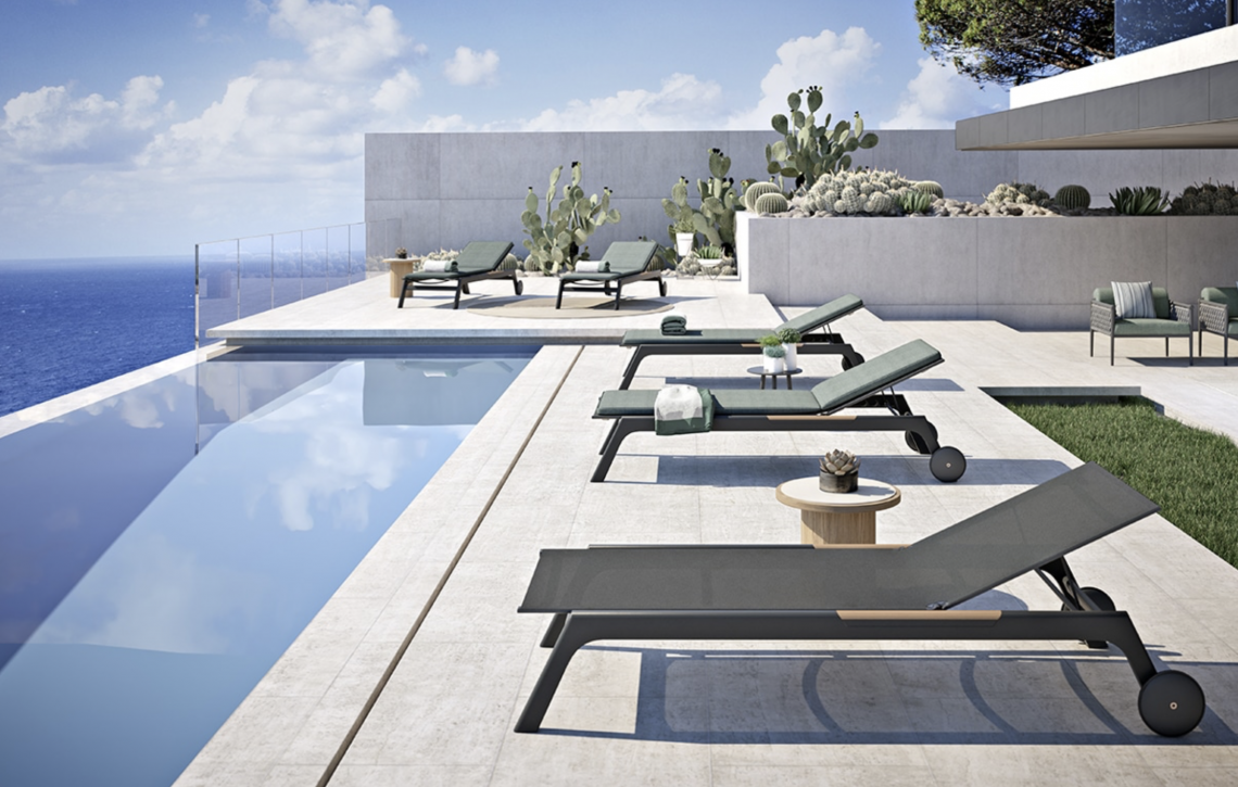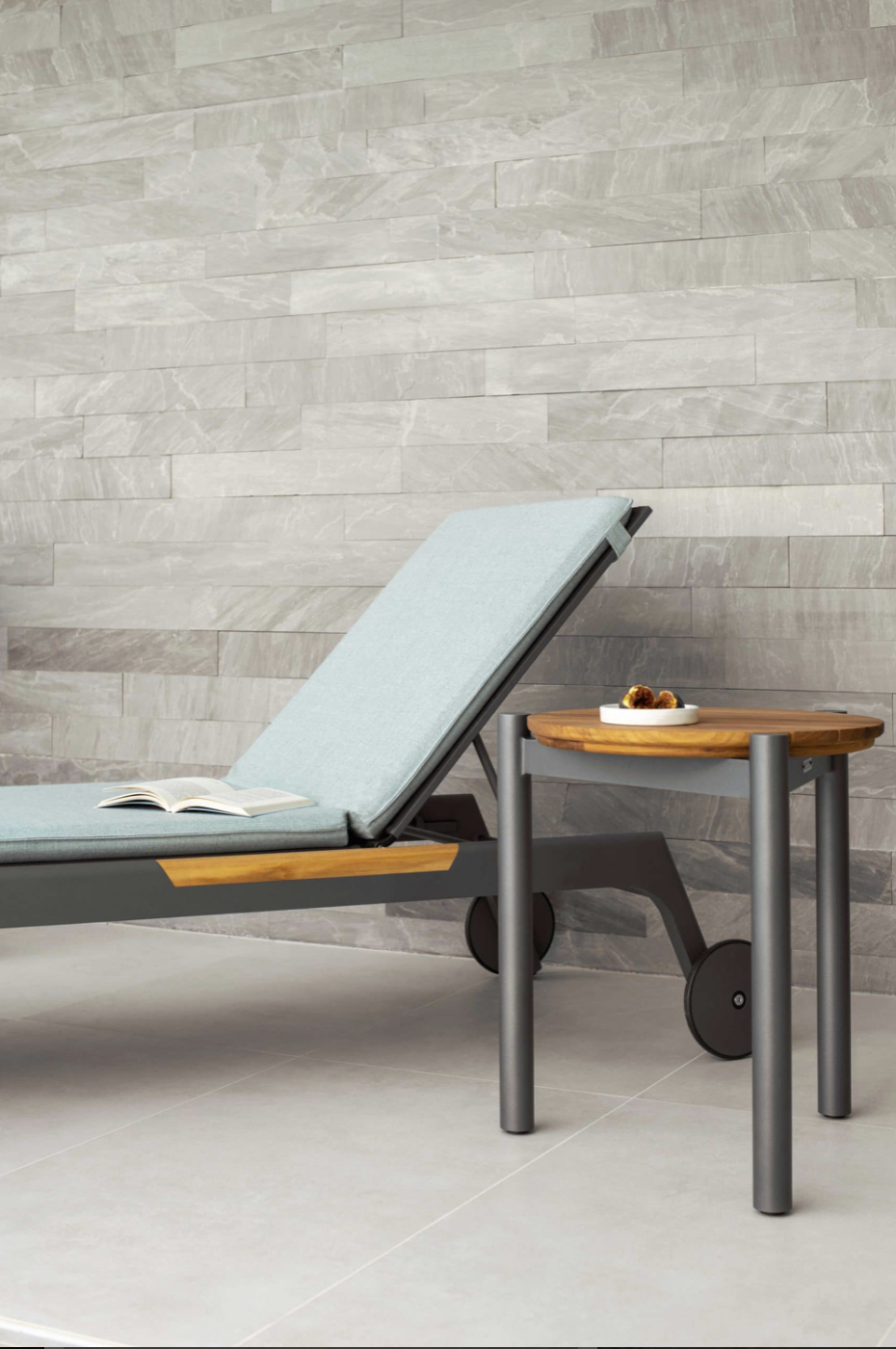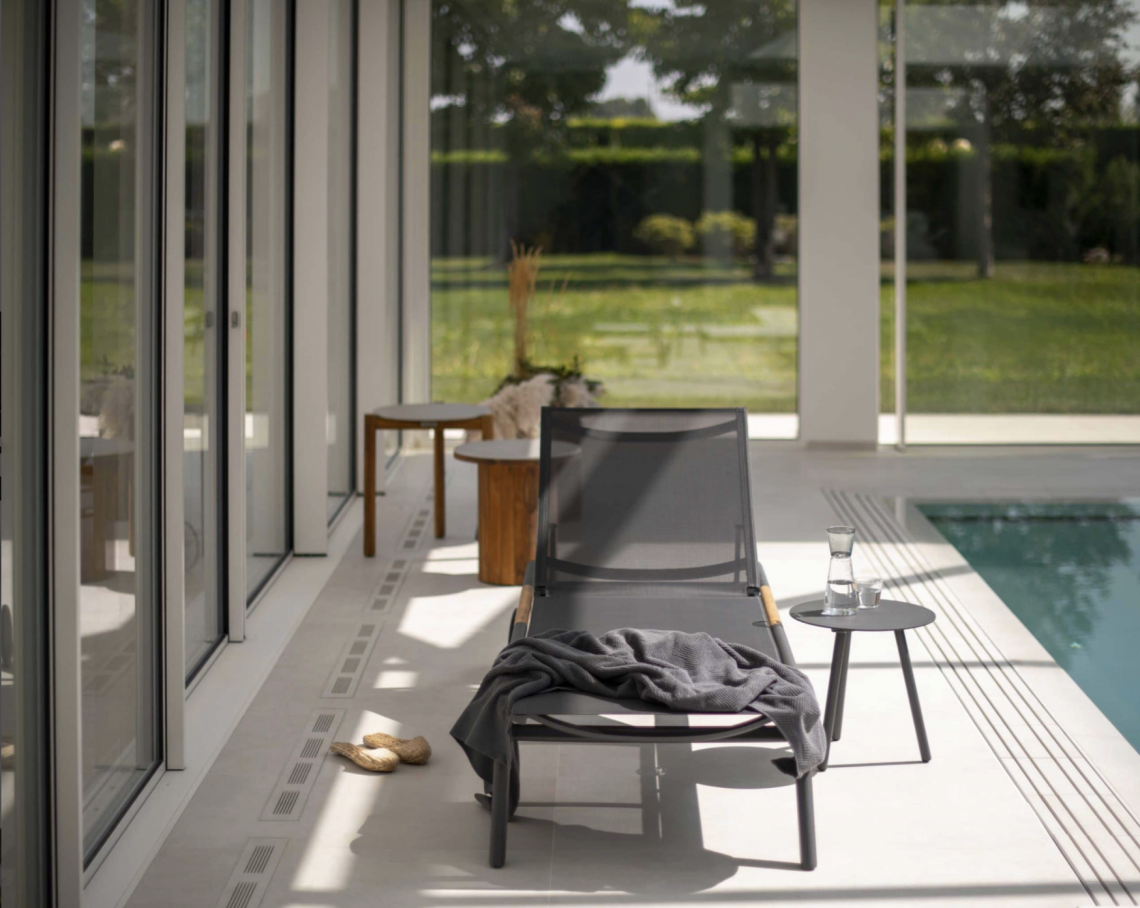 Puro, pulito e senza tempo. Il lettino in alluminio grafite o bianco con inserti in teak risulta ideale per lo spazio esterno e adattabile a qualsiasi contesto dal residenziale al hospitality.