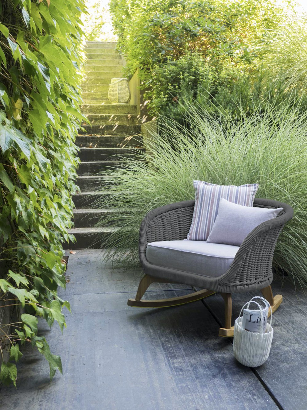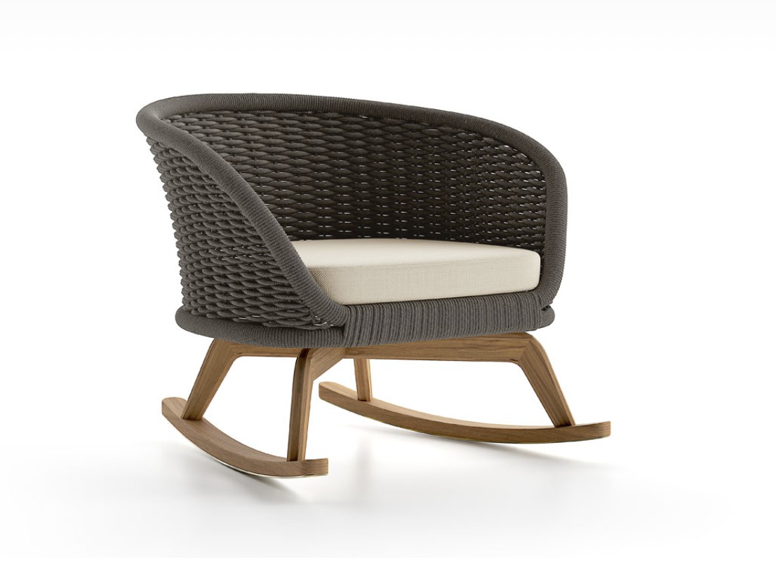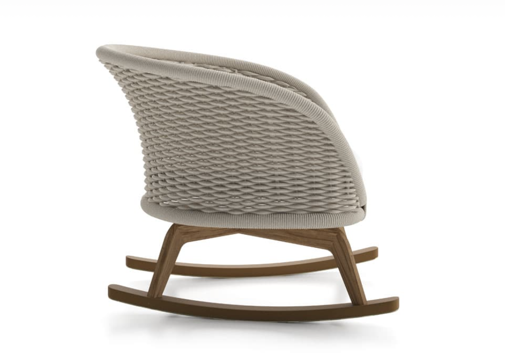 Poltrona con base in teak abbinata a corde intrecciate a mano in fibra acrilica di Teflon, a sezione tonda, resistenti all’acqua e di facile pulizia. Il materiale presenta un appeal morbido e raffinato simile ad intrecci tessili. Si caratterizza per la sua resistenza ai raggi UV e per la velocità di asciugatura.