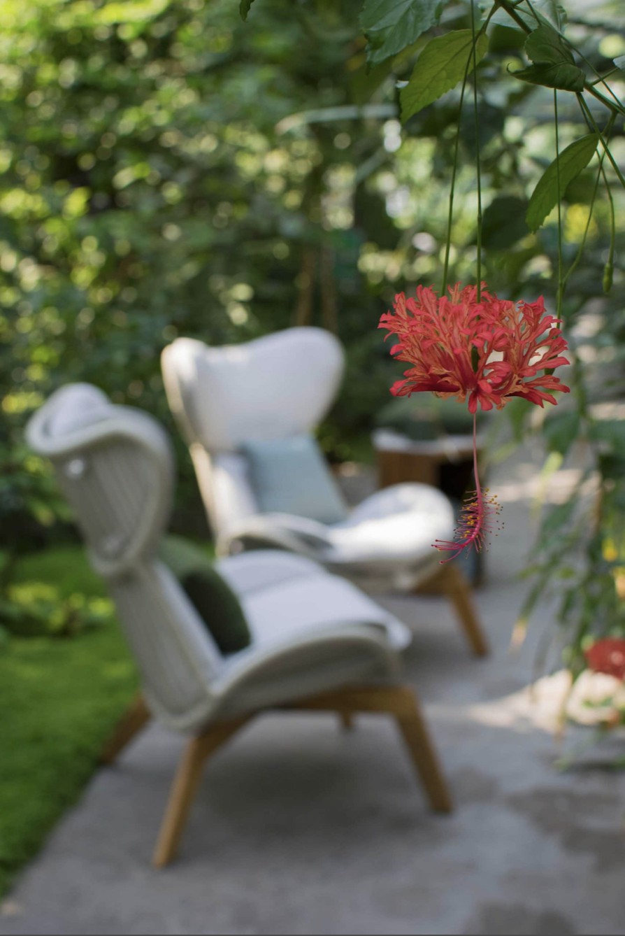 Poltrona con struttura in teak abbinata a corde intrecciate a mano in fibra acrilica di Teflon, a sezione tonda, resistenti all’acqua e di facile pulizia. Il materiale presenta un appeal morbido e raffinato simile ad intrecci tessili. Si caratterizza per la sua resistenza ai raggi UV e per la velocità di asciugatura.