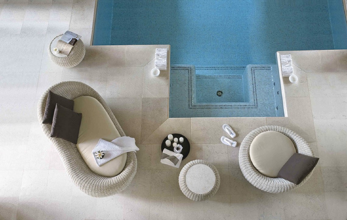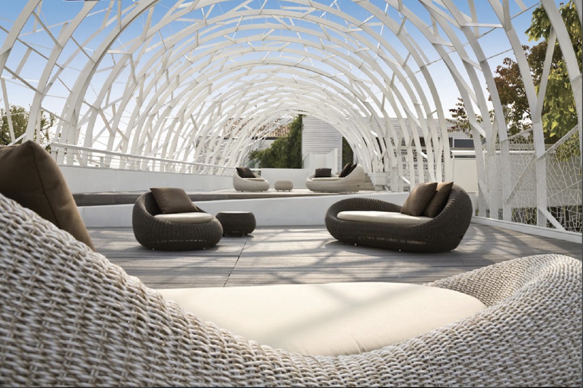 Strutture in alluminio verniciato epossidico per esterni. Intreccio in estruso di polietilene solidificato ad acqua, intrecciato a mano.