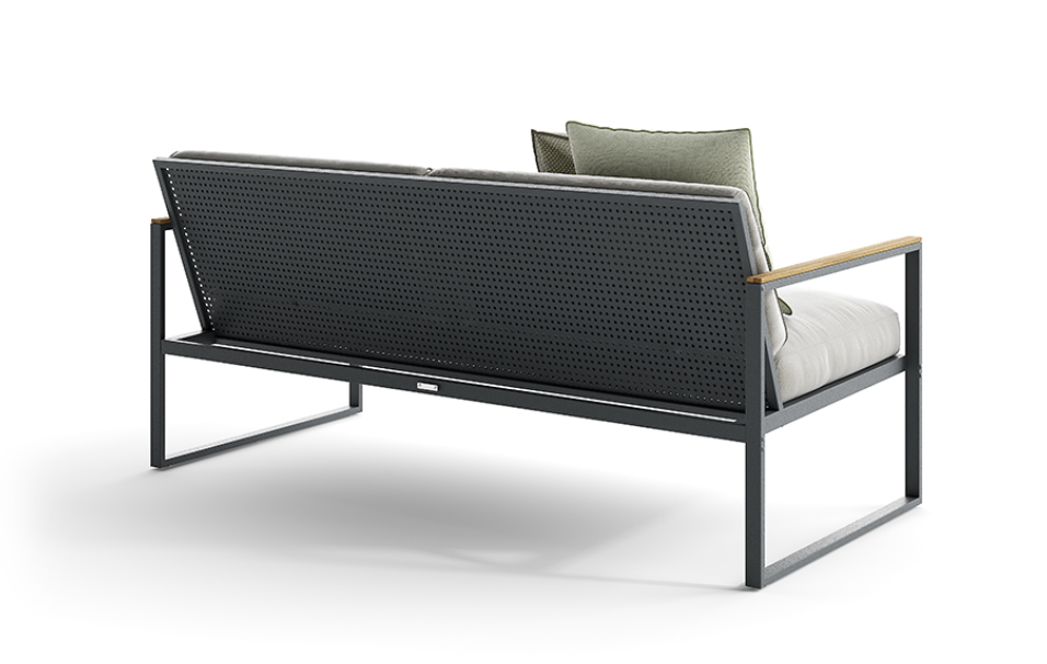 Strutture in alluminio verniciato epossidico per esterni in colore bianco e grafite, dettagli in TEAK Asiatico.