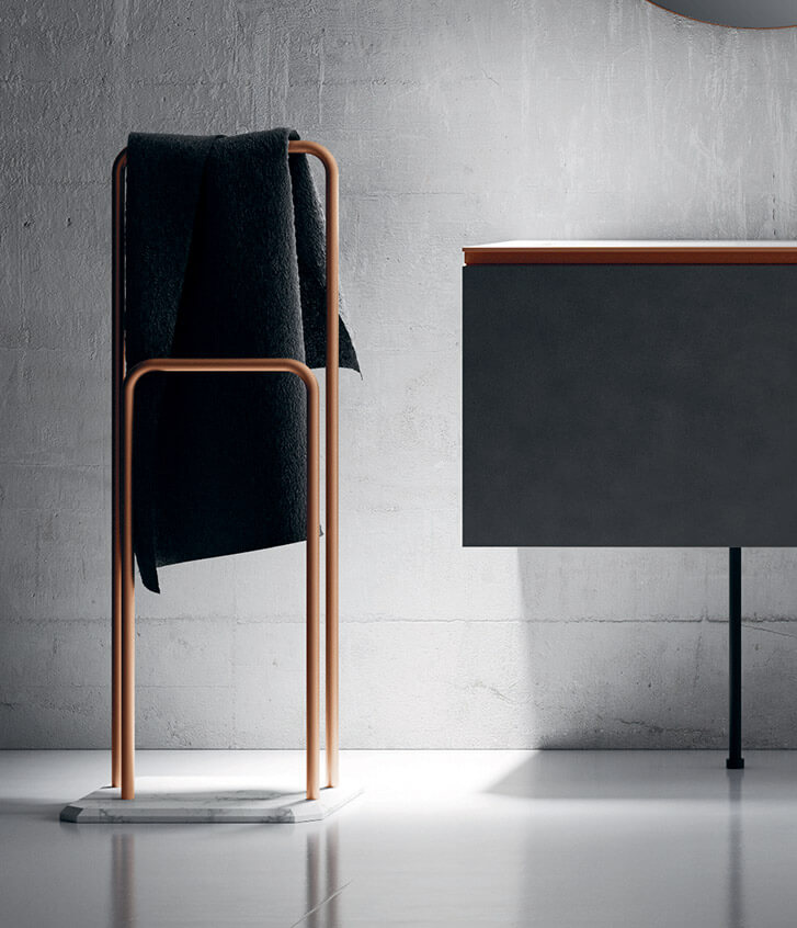 A washbasin unit with dark, intellectual nuances, thin and essential feet in burnished metal, recalling the matching Tubino light, a bright marble top coordinated with the base of the floor-standing towel rack.
