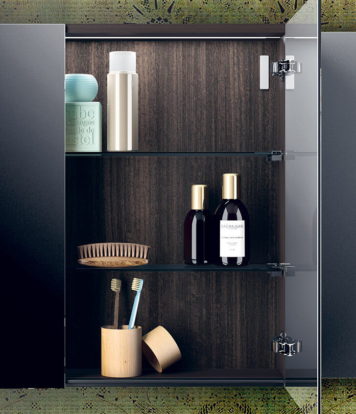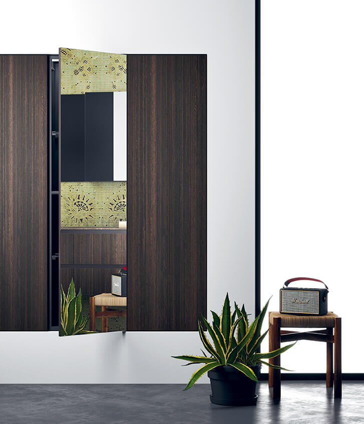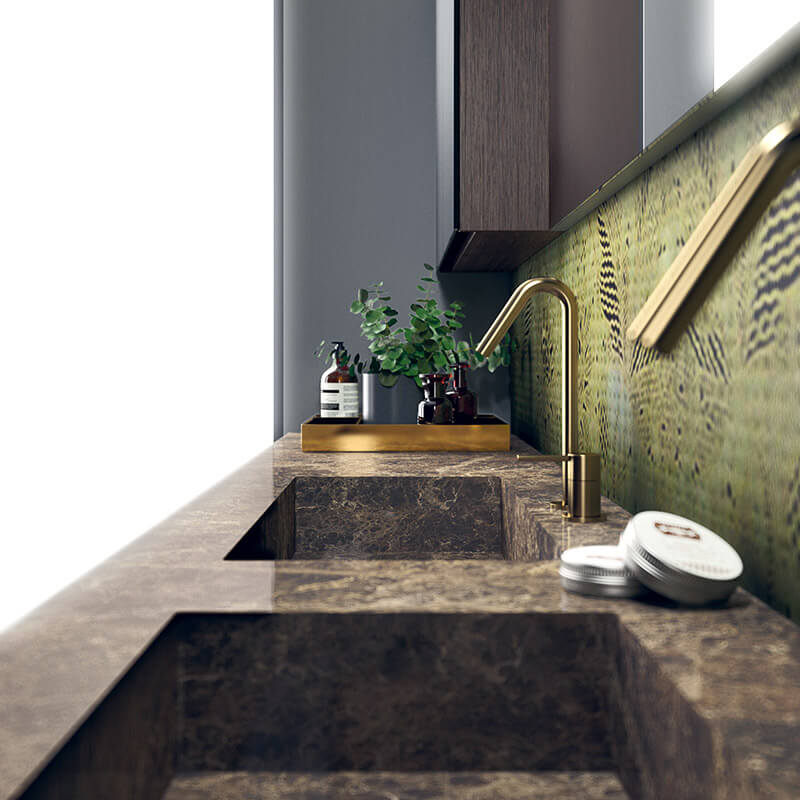 Elegance that becomes exclusivity: a double basin composition for contemporary luxury made of clean lines, essential forms, and materials featuring warm tones and natural effects able to transmit harmony and balance to the whole.