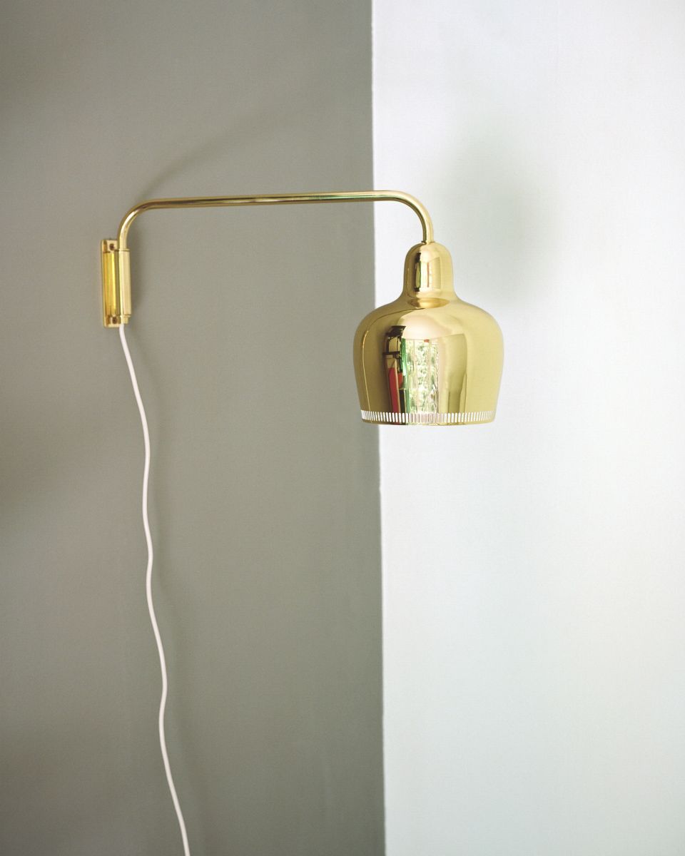 Wall Light A330S “Golden Bell” is a complement to Alvar Aalto’s popular sculptural pendant light. Its perforated rim creates a memorable corona effect and prevents glare, providing a light that is both warm-toned and characteristically diffuse. Affixed via a slender arm, it can be rotated through 180 degrees allowing for varying intensities of illumination. Available in handspun brass, or powder-coated steel in either black or white, “Golden Bell” Wall Light is an elegant reading light next to a bed, sofa, armchair or desk or warmly illuminates a kitchen table.