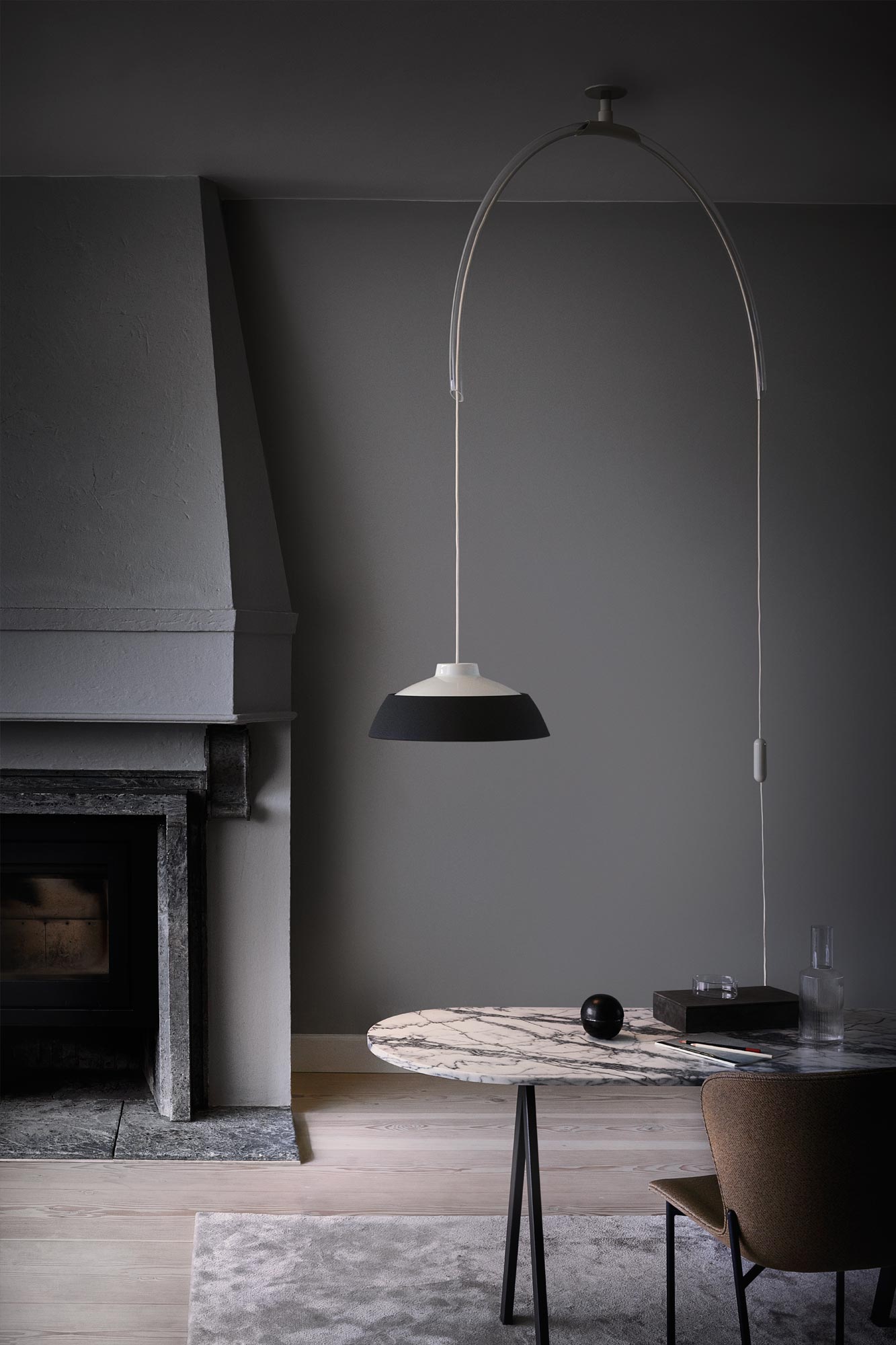 The intimate light provided by Model 2129 wraps the space in a warm ambience. The luminaire features a discreet counterweight and a large arc-shaped arm in transparent methacrylate that is attached to the ceiling and able to rotate 360 degrees horizontally. The cup-shaped reflector is made of two lathed aluminium pieces painted white and caviar grey. Both the dowel for the ceiling fitting and the counterweight are made of painted brass.