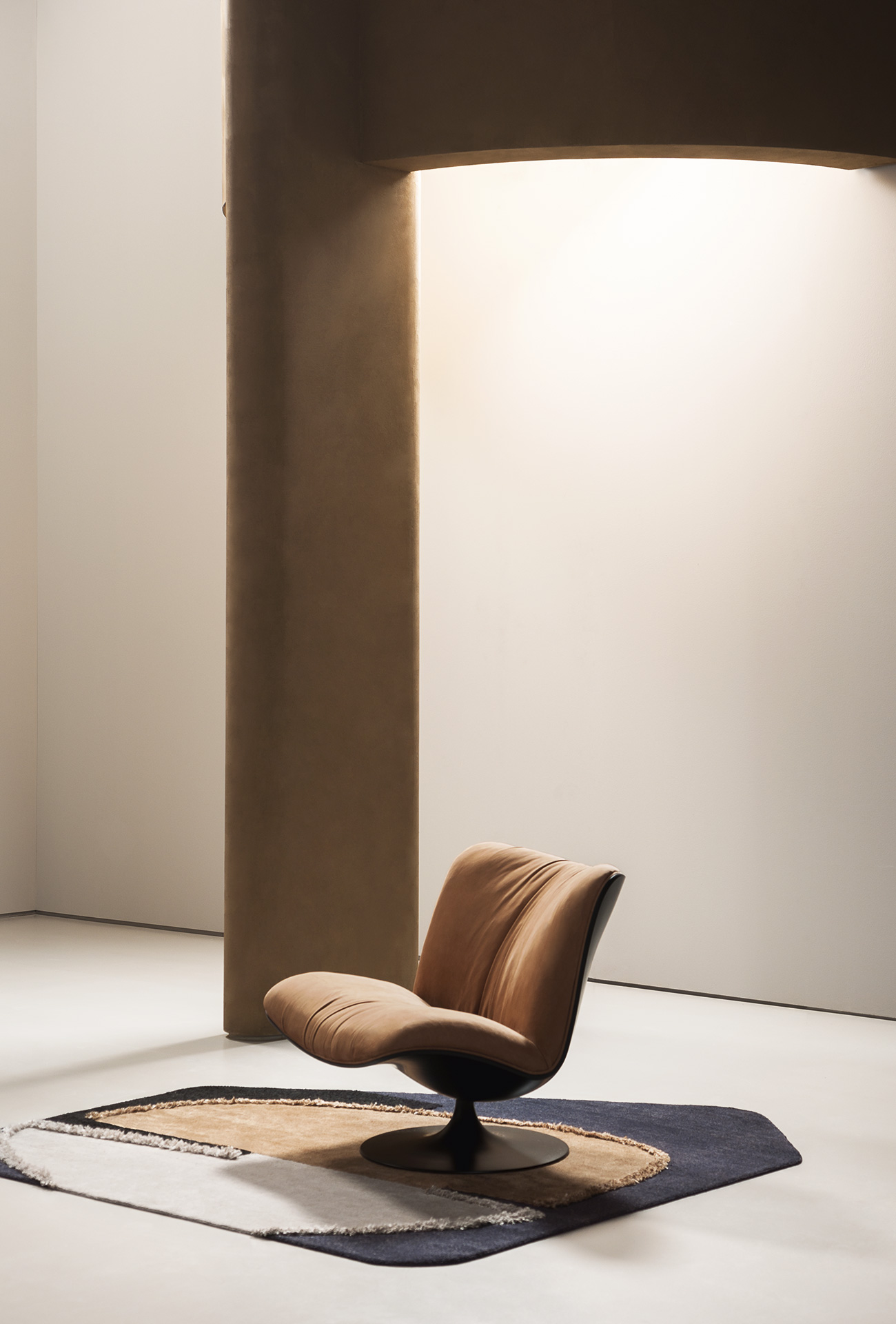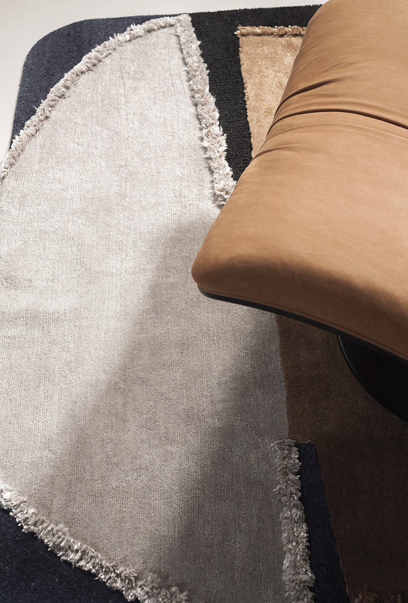 Himani is a collection including 3 iconic rugs produced in limited and numbered series. A combination of irregular shapes. Each rug is characterised by a series of contrasts: texture, three-dimensional elements, uneven surfaces matched with smooth ones, they are all interrupted by a series of organic lines, that give a note of contemporary. Glossy and matt effects, given by the contrast of vegetable silk and wool, react in a different way to light; thanks to light, the refinement of colour combinations in every section of the rugs can be subtly perceived. The different heights of the fleece (“shaggy” on purpose and meticulously hand-finished by expert craftsmen) are softened by more refined parts and complete every rug, adding a touch of elegance.