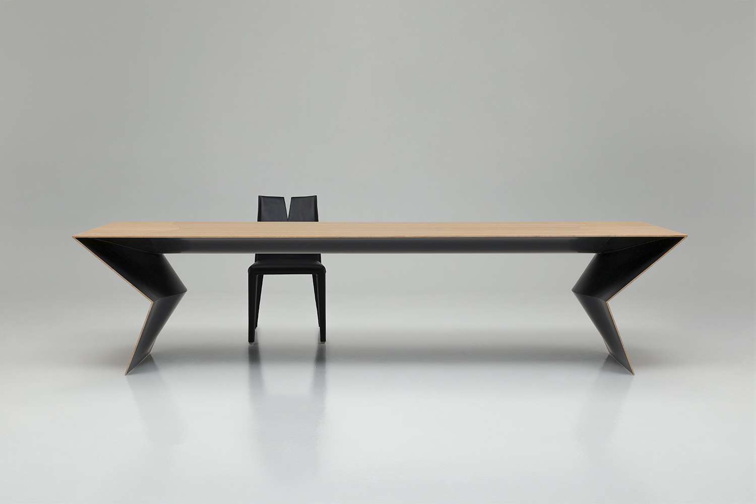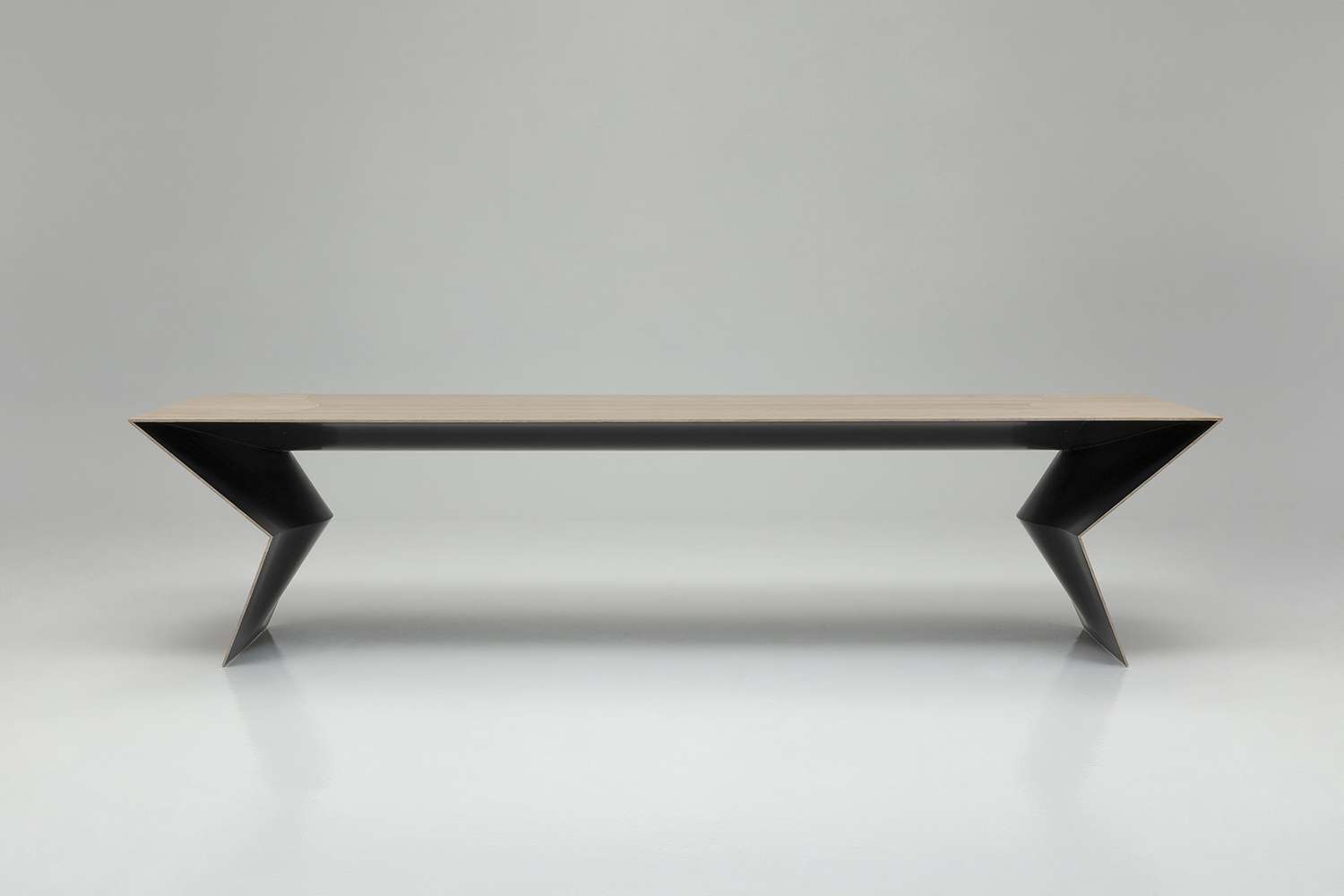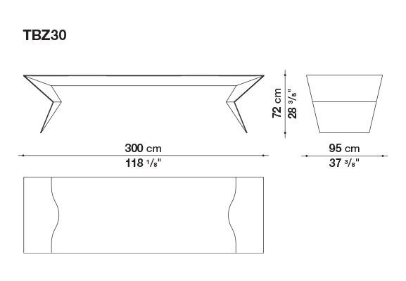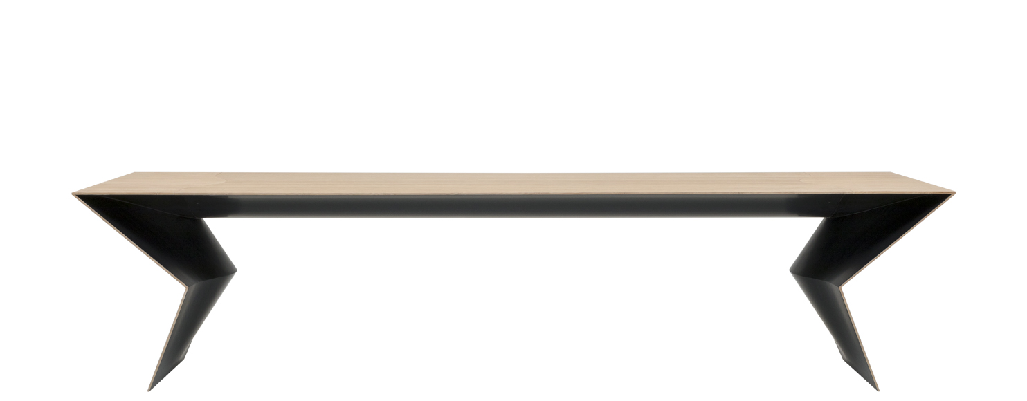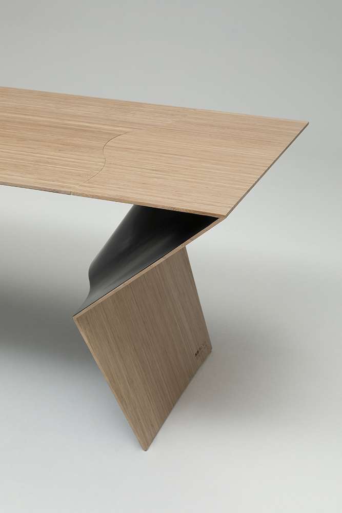 A sculptural table, a powerful and unexpected item - Blitz is an amazing new Mario Bellini’s project for B&B Italia. A flat, slim and geometric external frame finds its natural completion in the curved and sinuous shapes of the interior, aesthetic and constructive solutions reminiscent of a suspension bridge are revealed. Bamboo was chosen for the frame due to its lightness and rapid growth. It is a versatile wood with intrinsic features which are ennobled by a fine solid wood processing. It is unexpected and unusual for indoor use but one that follows and relaunches the traditional quality of B&B Italia materials; this is for an object which is a unique synthesis of design, engineering and high-quality cabinetmaking. The table’s external parts show the natural bamboo grain, underlining the quality, care, and precision each wood module has been worked. The surface pattern contrasts with the table’s interior, where we discover a soft black finish with shellac effect. It is a solution that generates surprising visual effects of flat surfaces that appear to be floating on curved shadows. The three-metre-long and 95-centimetre-deep top folds at the ends like origami, becoming a support that tapers and folds again to rest on the ground.