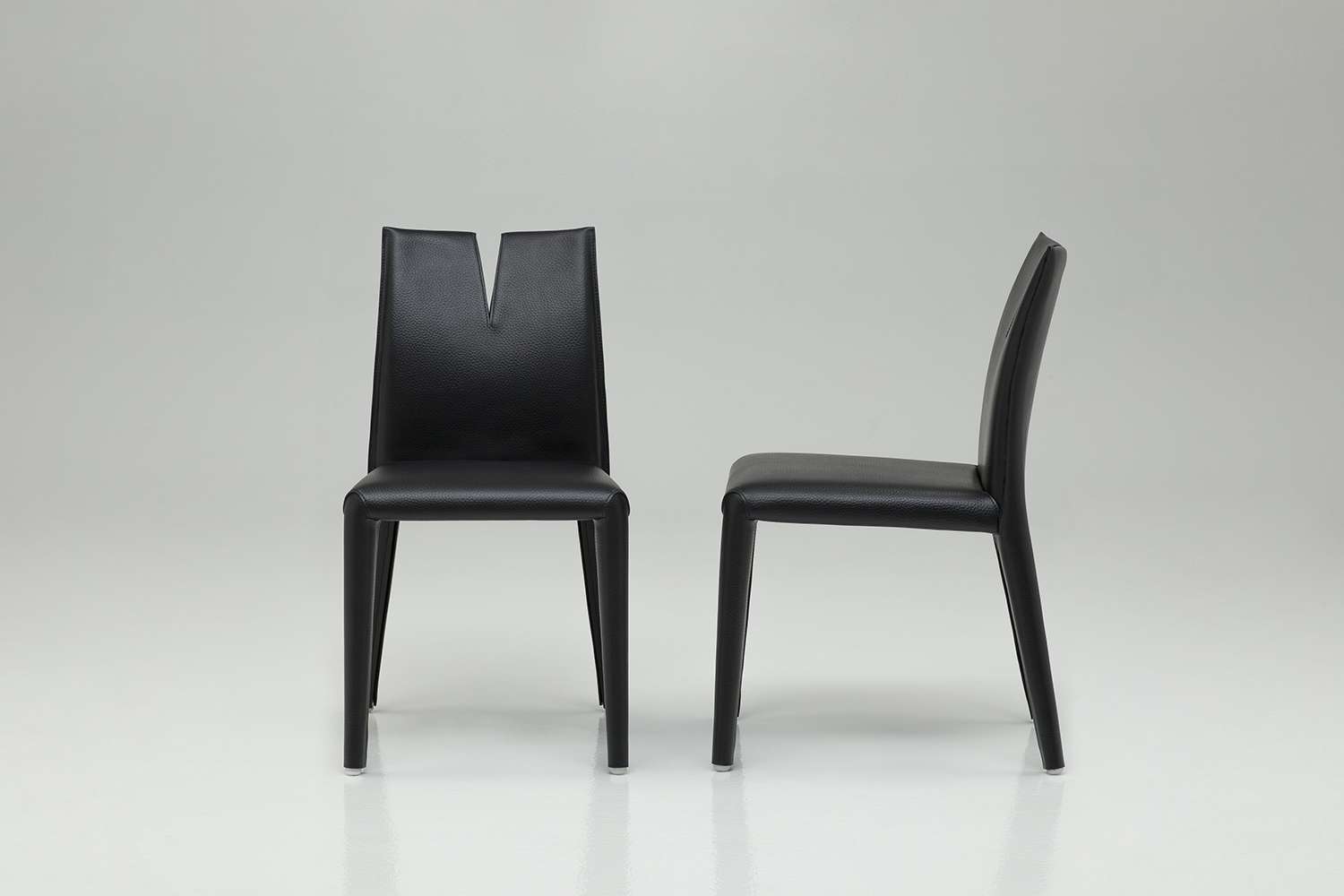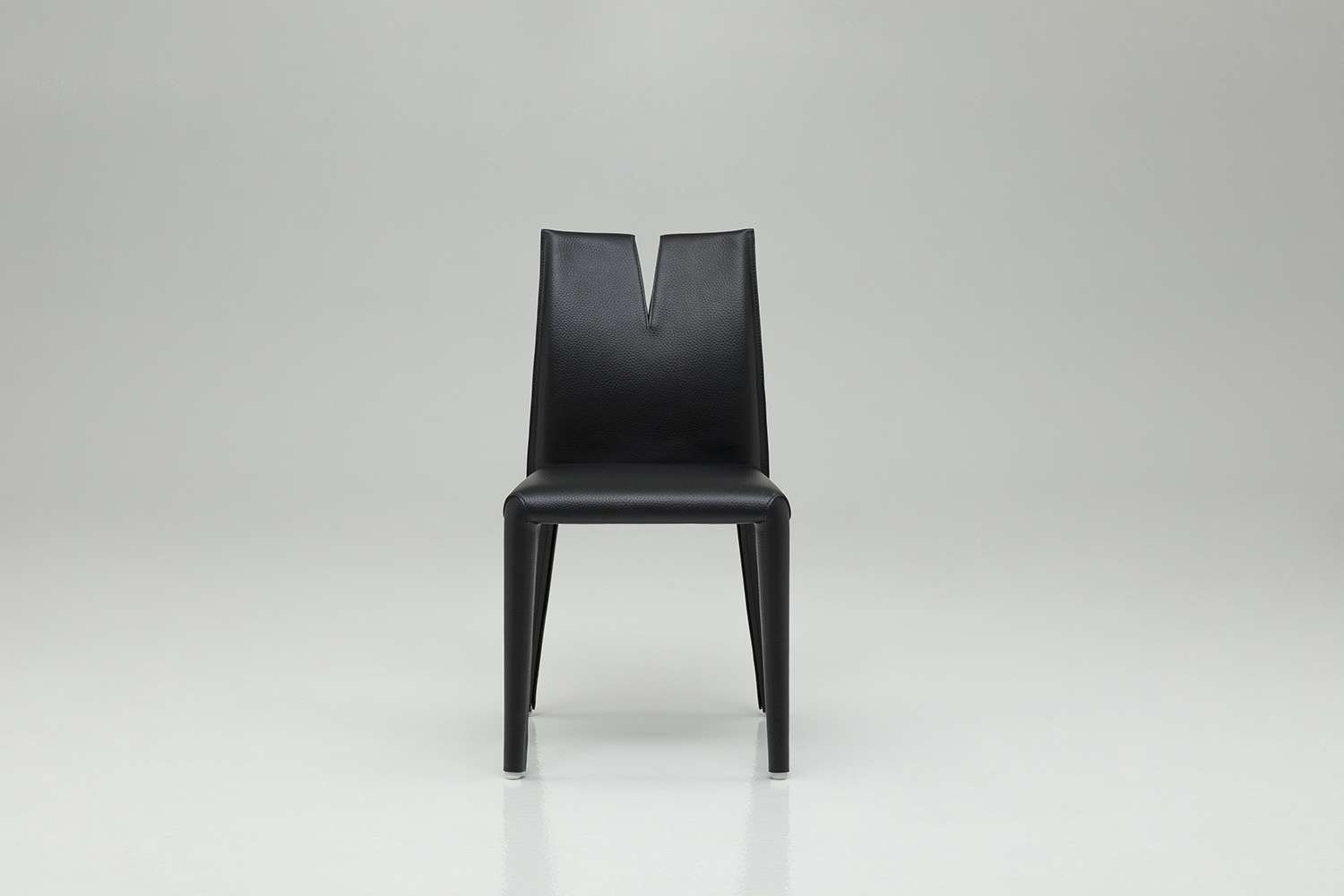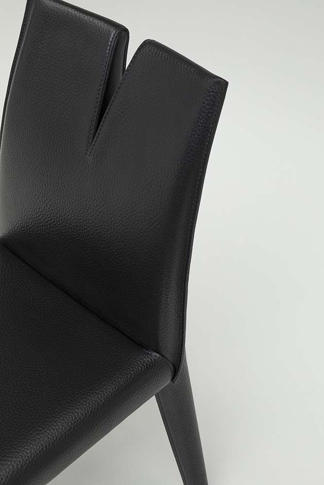 Cutter is Mario Bellini’s new chair with strong and decisive aesthetics which create a new type of seating. The back of the chair is slashed by a cut which is pays homage to the great artist Lucio Fontana. Although evident, Cutter’s nature does not only lie in an aesthetic choice but generates an unprecedented type of seating. The twin backrest’s ends are functional and comfortable in a frontal position, while moving independently and allowing a lateral position. This gesture is suitable for chatting with the person seated nearby. It is also designed to ensure high comfort seating and casual movements, allowing the user to lean on one side with an arm placed around the backrest. The seating frame is made of metal and webbing, softened by a classic polyurethane upholstery. To guarantee elasticity and strength to the double backrest, B&B Italia’s Research & Development Centre has opted for a sophisticated harmonic steel core. The upholstery and cover fully envelop the chair in embossed thick leather, creating an ideal synthesis of softness and rigour, underlined by saddle stitching. The central cut reveals an inner part in refined black Saffiano thick leather, as if Cutter’s soul peeps out from this dramatic opening.