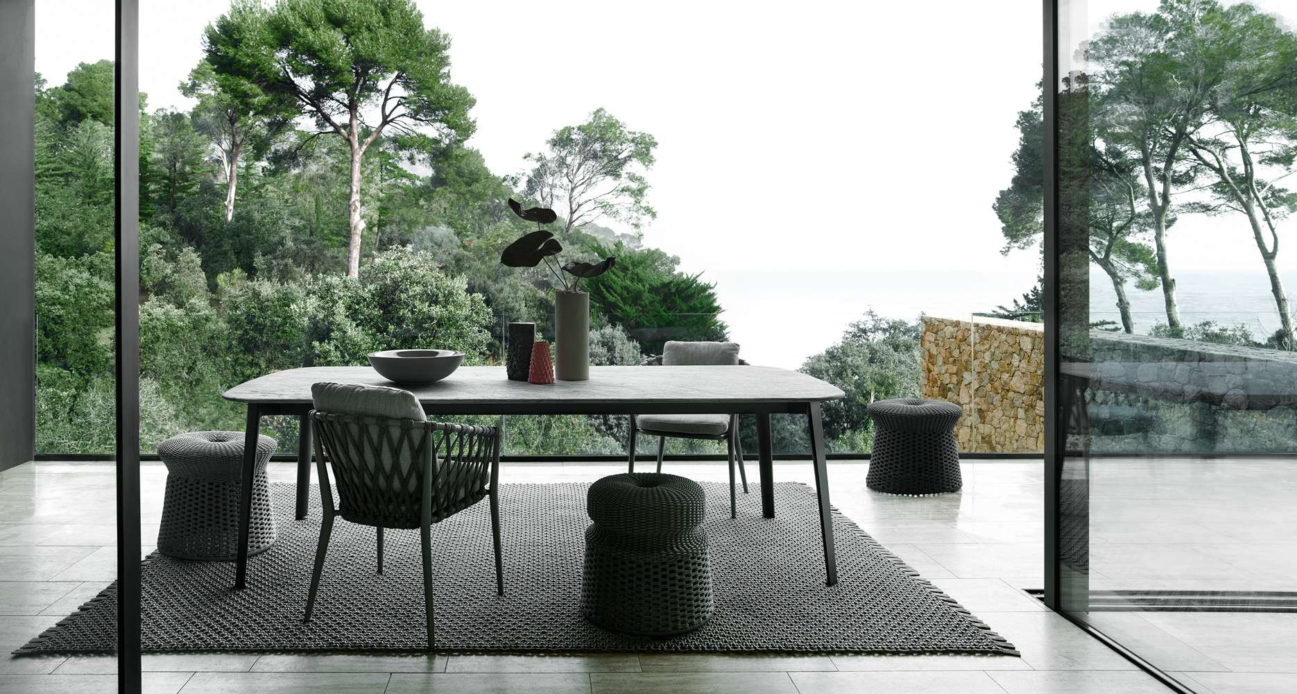 The Ginepro table is made with an anthracite painted aluminum structure and a Serpentine stone top. Extremely durable and precious as the linear and timeless style. With its two shapes (round and rectangular with rounded corners) and four dimensions, it lends itself to be placed in different outdoor enviroments: terraces, verandas, patios and gardens.