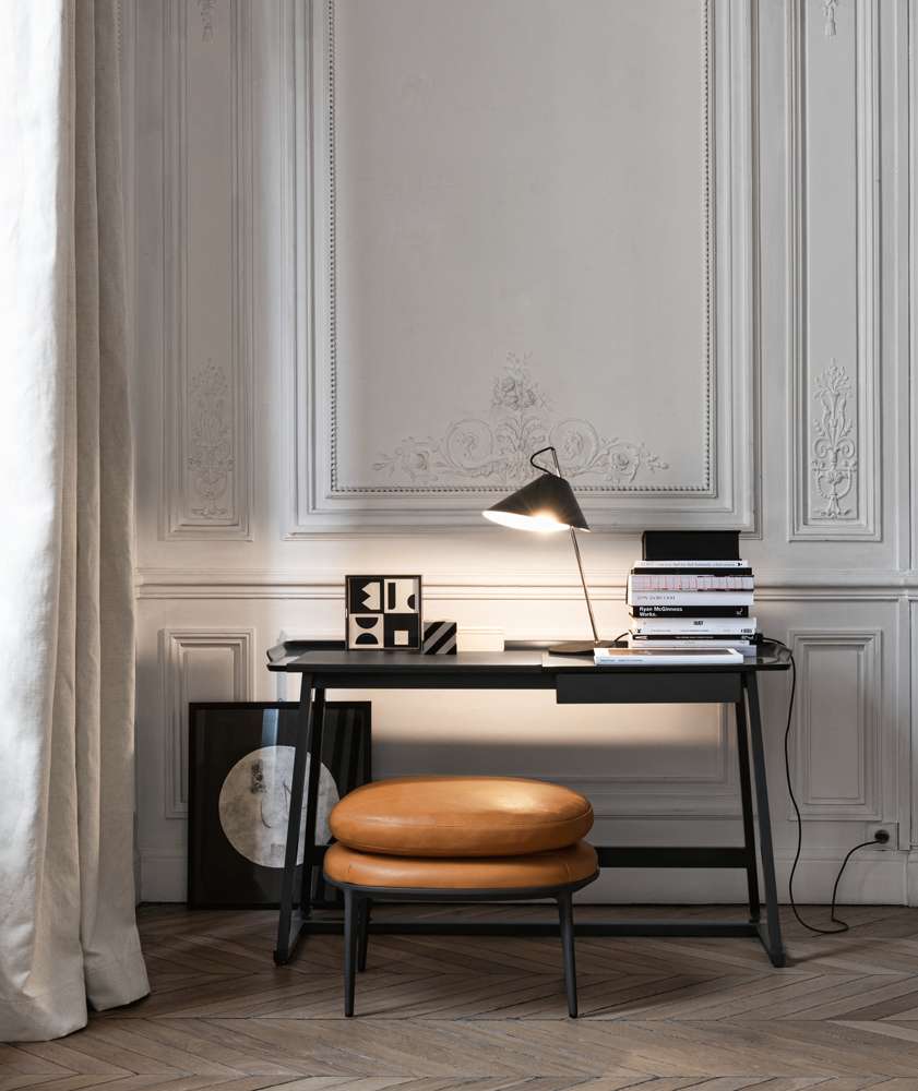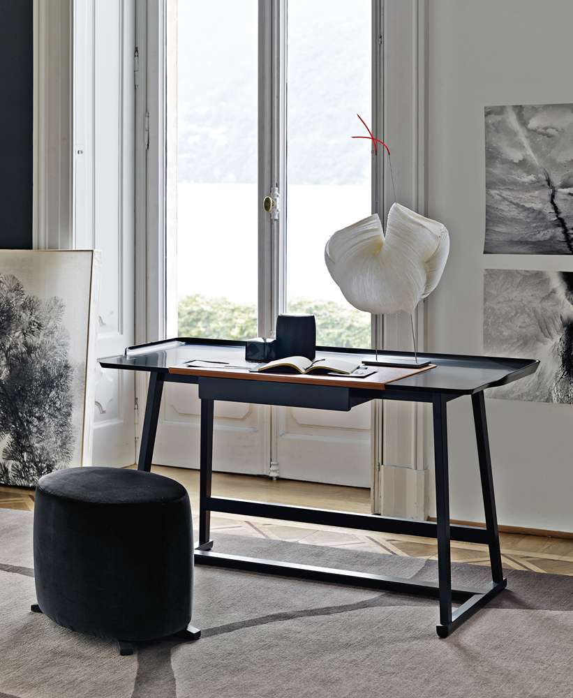 Recipio, born of an element designed to act as a bedside table, today the collection includes a console, a series of round and rectangular multipurpose tables, a writing-desk with a drawer and a dining table in two sizes available in grey oak, brushed light oak or brushed black oak. All elements have a tub-shaped top that resembles a curved tray. Recipio is available in the shellac finish in black, red and soia.