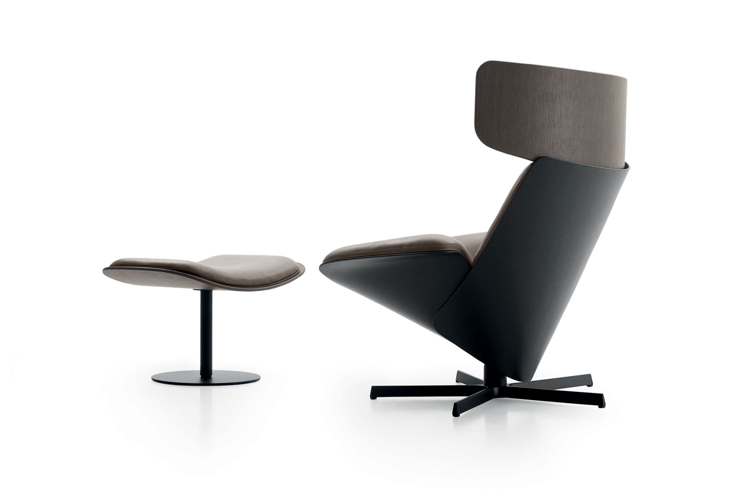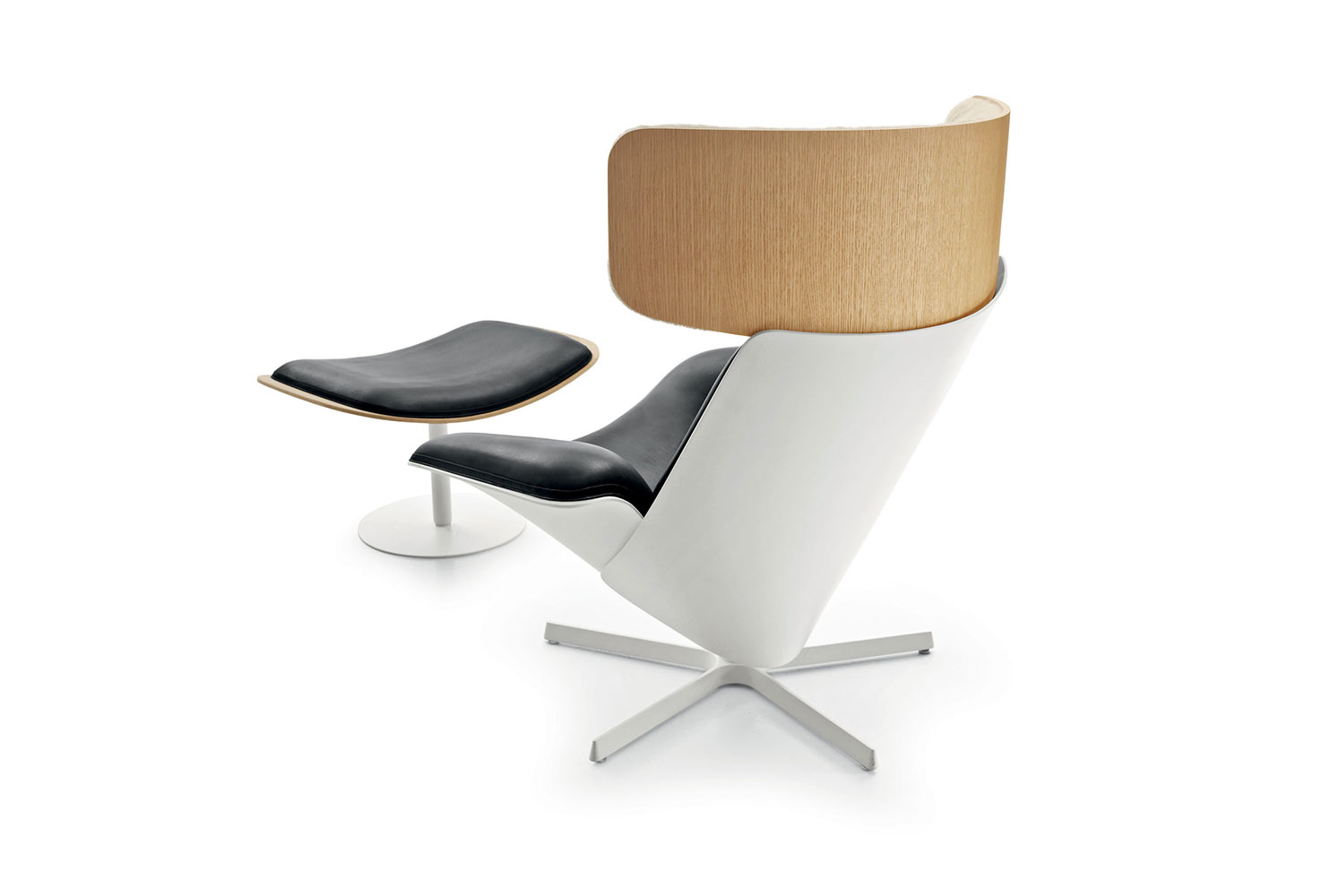 這款轉椅專注于放松休閑,它包含兩個圓錐形玻璃纖維外殼:一個將底座和靠背連接在一起的座椅。頭枕是一塊帶有弧度的橡木,內部有填充物,并從靠背上向外伸出。這款椅子的突出之處是它在眾多不同元素、材料和皮革飾面之間找到了平衡——還可以選擇用美利奴羊毛作為頭枕的材料。