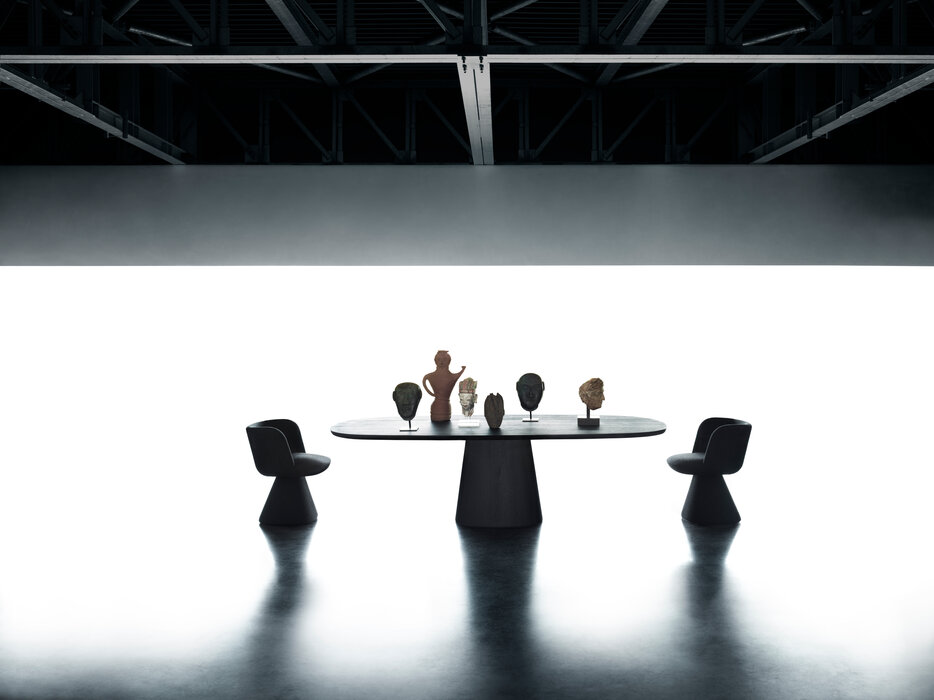 The Allure O’ table is presented as a heart-felt tribute to glamour interpreted in contemporary style. The graceful force of its design is clearly seen in the shape of the top and the balance between the control of straight lines and sinuosity of curves. In an interplay of elliptical geometric shapes that recalls the Madison mirror, designed by Monica Armani in 2017, this piece renews the reference of the shape of Jackie O’s iconic eyeglasses. Allure O’ is available with a square or rectangular top, both with bevelled edges, and each comes in two sizes to seat four, six, or even eight people. The section of the truncated pyramid base replicates the rigorous balance of the top with delicate proportions to create a level of harmony that can guarantee structural and visual stability. The finishes underscore the sophisticated elegance of the inspiring concept behind it. These pieces are available in glossy and matte painted finishes in many colours, and also in light and black oak wood. The top and base can also be finished in combinations of different colours. Furthermore, the table Allure O' can be enhanced with an upper marble top or with sophisticated glossy black glass.