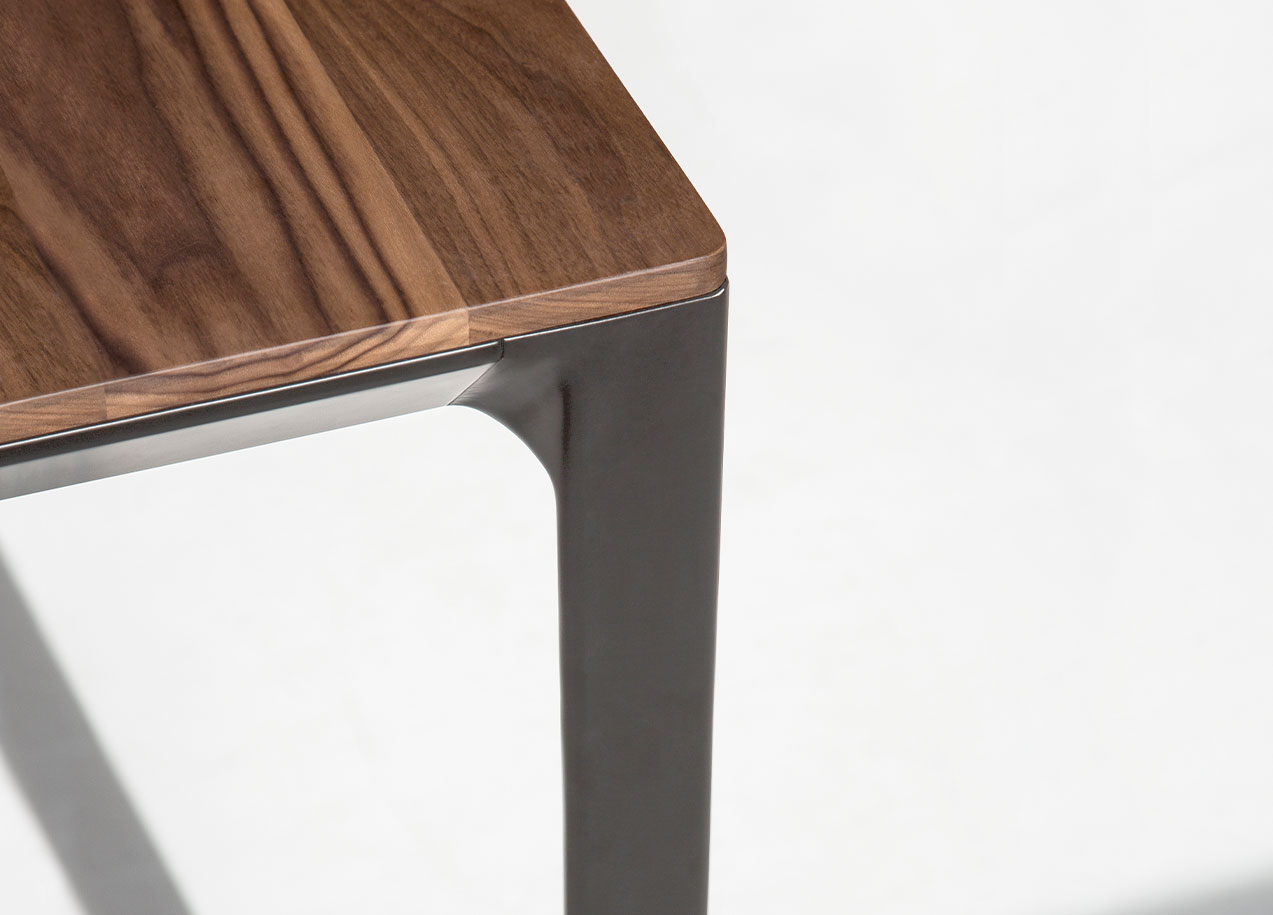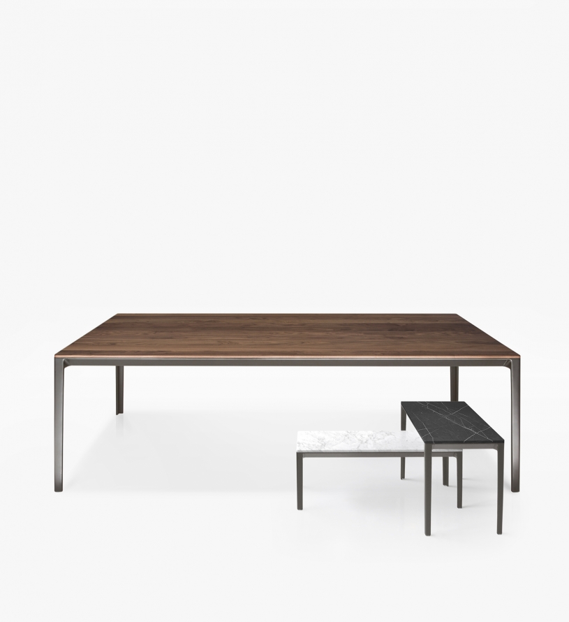 The Able collection is a family of tables that offer a variety of solutions as they are available in several sizes and materials. Cast aluminium legs and aluminium rails support tops in wood, marble and Polaris.