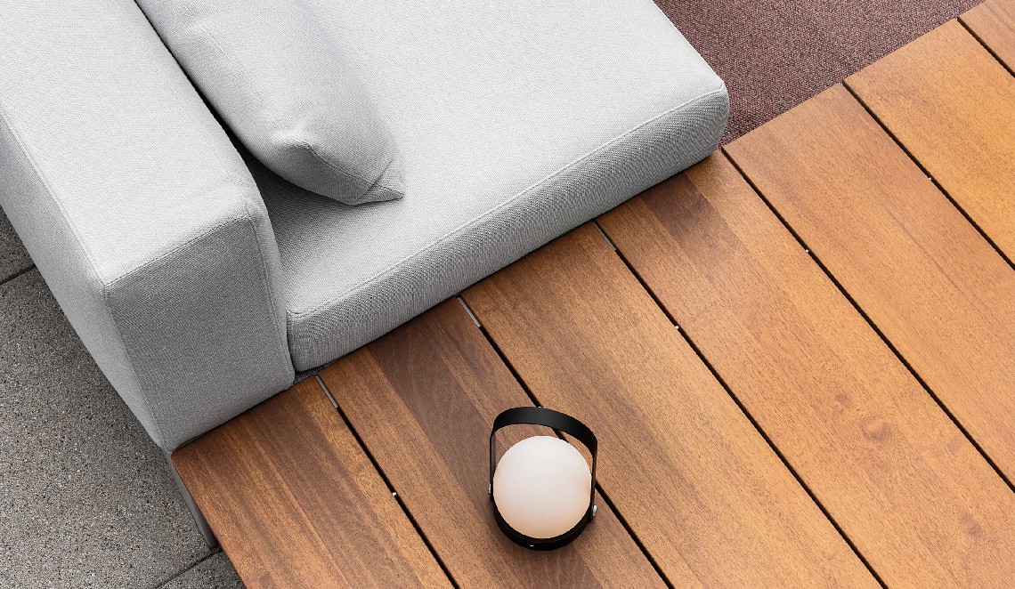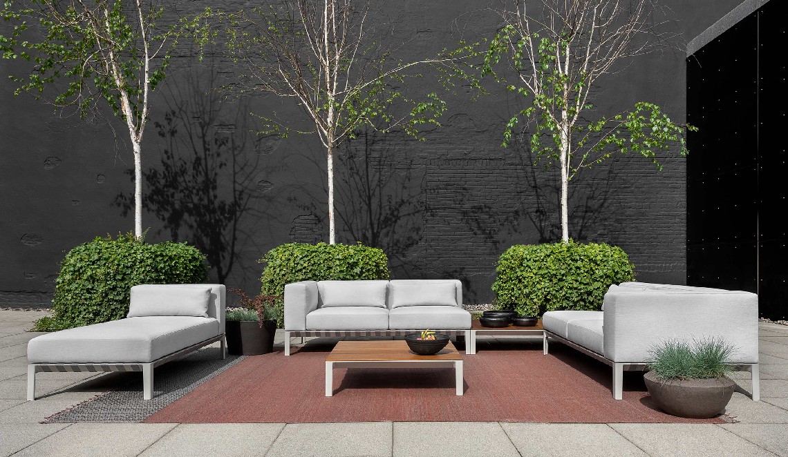 The generous shapely upholstery ensures comfort and achieves visual lightness supported by the woven bands that wrap the slender orthogonal frame.