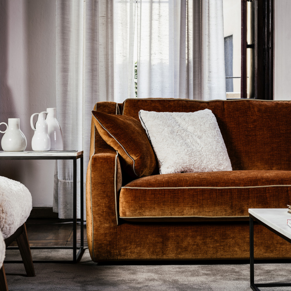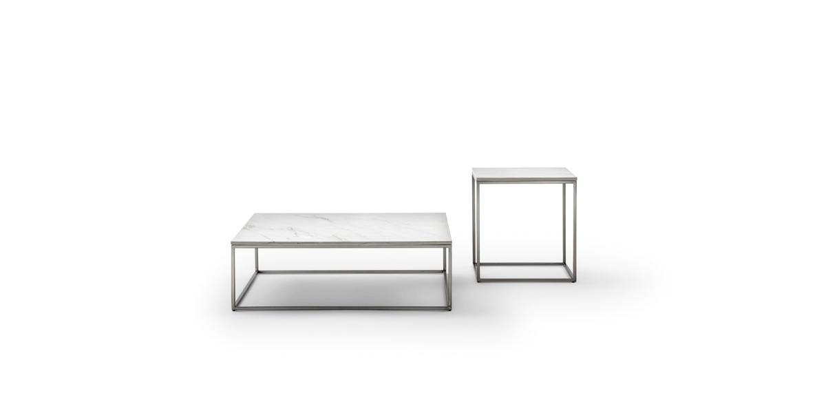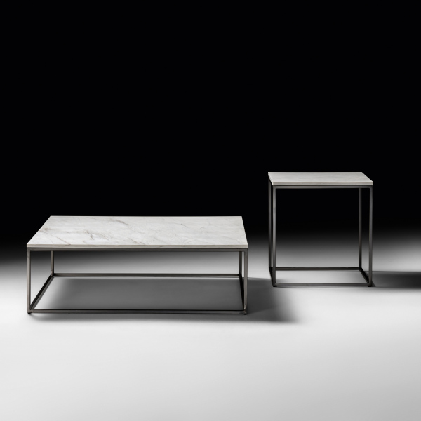 Tables with supporting structure in metal matt dark bronze finishing. Top in Elegant Brown stone, in matt