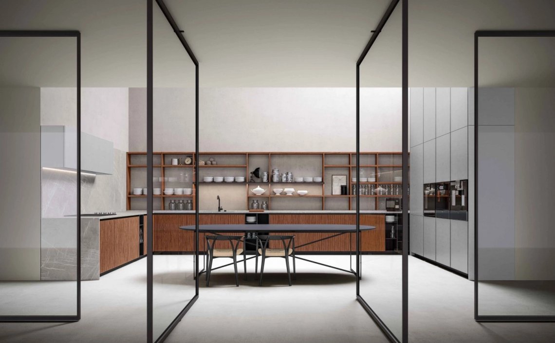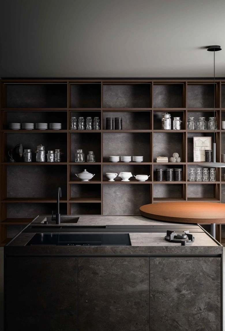 Modular system for open back wall-mounted or freestanding bookcases. It features the same vertical and horizontal thicknesses as Antibes, characterised by a great compositional flexibility, thanks to the various heights of the side panels and different widths of the shelves and base panels, while their thickness (side panels: 220 mm, shelves: 380 mm) and their depth (400 mm) do not change. The available finishes include matt lacquers and veneered wood species of the Boffi collections. The system allows to create floor-to-ceiling compositions also freestanding, which must necessarily be fixed to the ceiling. Antibes bookcase can be installed on kitchen worktop too, used as storage system. LED bar lightings complete the elegant architectural product. Design Piero Lissoni and C.R.S. Boffi.