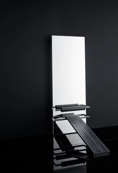 A wall-mounted fitness equipment characterised by small dimensions and a minimal design, conceived for the home environment and based on the precise need of incorporating all the typical functions of a Swedish wall bar system. Origine is made up of a front panel in mirror or Lasemat finish (Fenix Ntm? "soft touch" matt nanotechnology surface) supported by an aluminium structure and equipped with two frontal steel sliding bars, which are equipped with lock, covered in wood, matt black painted. This Swedish wall bar can be equipped with three types of tools: a 1400 mm long solid matt black painted wood bench, to be hooked to the front bars; a set of black rubber bands with matt black painted wooden grips; two pillows, one large curved and one small cylindrical covered in black technical material, to be inserted in the bars. Design Alessandro Andreucci, Christian Hoisl.