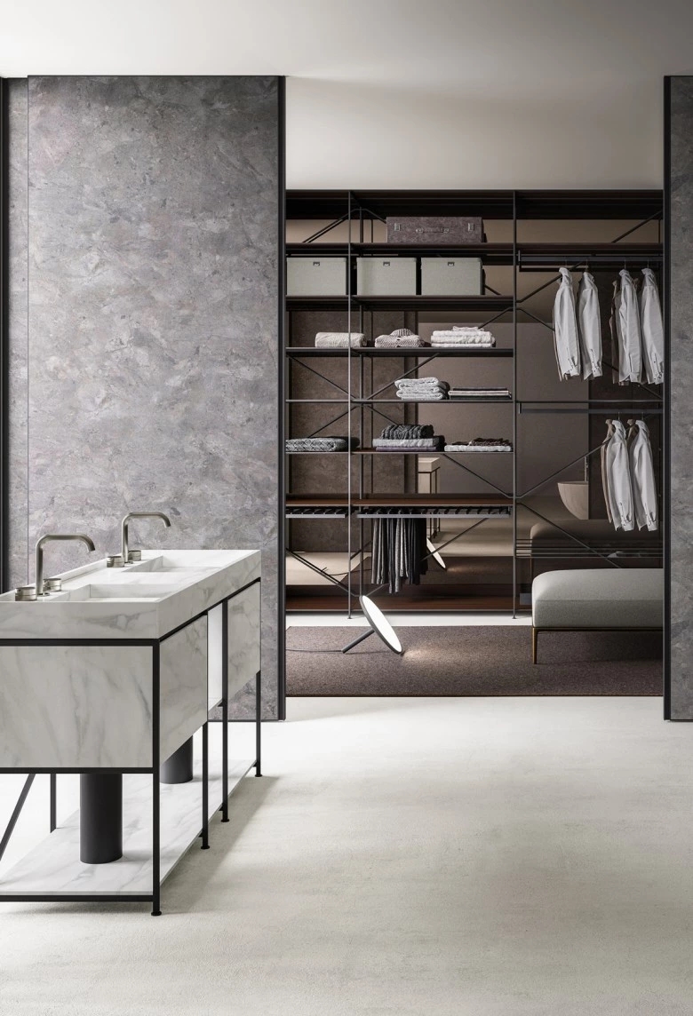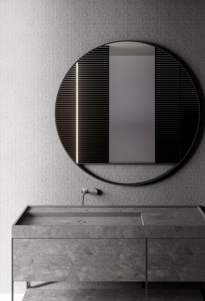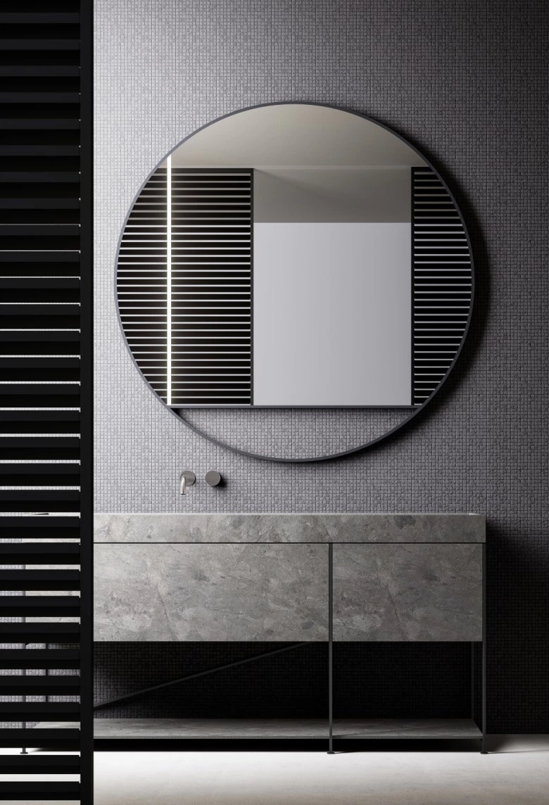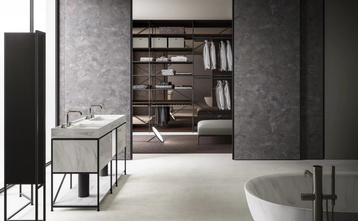 The acronym R.I.G. (Rudimentary Interior Geometry) defines a universal modular system for shelving and shelves based on a thin, linear structure made of AISI 304 solid stainless steel, in embossed black or brass painted. The R.I.G. system, developed in several versions that can furnish different spaces, has been designed by Mikal Harrsen, Danish industrial designer and founder of the MA/U Studio brand, which is part of the Boffi | De Padova group. In the version specifically designed for use in bathrooms, the elements of the metal structure - uprights, rods, stabilizers and supports - compose a sober and solid frame to support shelves, tops, fronts, panels and top-mounted washbasins, including some special models. The metal elements of R.I.G. are also developed as frames for mirrors (with or without integrated light), as for light bars and towel rails. The R.I.G. Bathroom system creates customised wall or island compositions thanks to the wide range of materials, colours and finishes available for tops and shelves, from lacquers to wood, from MDI composite to Corian?, from marble to stone and glass. The top-mounted washbasins can be chosen from the Boffi range or from the collection created specifically for this bathroom system - RD1 and R.I.G. models by Mikal Harrsen - available in various sizes and different materials (Corian?, stone, marble, MDI composite). Design Mikal Harrsen.