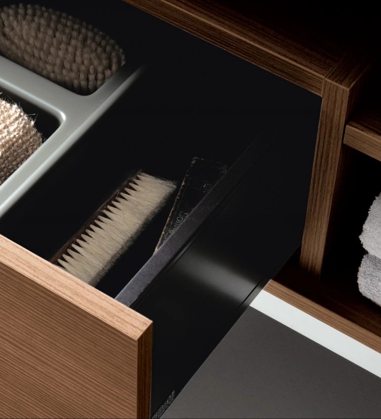 Wall hung, modular units with handle-less fronts and three different door opening methods: hinged, pull-out or coplanar sliding. The doors are gripped (and opened) through the specific handle-rail, mounted on the upper part of the cabinet. The aluminium handle-rail can be covered in the same finish as the top or the front to give a single-material look to the composition. Free Zone offers a wide range of composition possibilities, starting from the types of compatible washbasins with the square-edged top: top-mounted, built-in, under-mounted or moulded flush-mounted. A wall hung tall unit with door completes this bathroom collection. For the materials of tops, panels, fronts and doors, the choice ranges from all Boffi collections, from lacquers to woods, from stones to composites, from glass to metals. Among the latest novelties, it is possible to use the composite MDI and the solid wood finishes Freehand (characterized by irregular horizontal furrows and horizontal grain) and Shades (characterized by regular vertical furrows and vertical grain). Design C.R.S. Boffi.