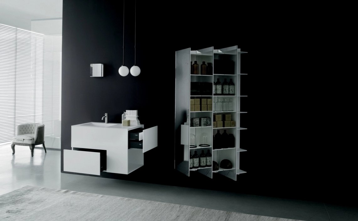 A compact, suspended washbasin base unit with integrated containing compartments, conceived as a solution to tight bathroom areas for both residential and commercial uses. The cabinet, made of MDF (Medium Density Fiberboard), is available in matt lacquered Silcover finish, in full colour range, completed by a top with washbasin in white Cristalplant?. A large front drawer, a side drawer with an additional internal drawer and an open compartment have been created inside the base unit for storage. The washbasin can be installed left or right hand.