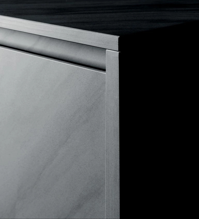 Wall hung, modular base units without handle, divided into monobloc elements and elements to be matched together, with end panels always in finish. The single front of the base units is pull-out and opens drawer units with internal compartments and drawers. The tops have a specific recessed finished band on the bottom, which create a handle-rail effect. This detail, in combination with the bevelled edge of the doors, offer the grip needed to open the door fronts. The band is in the same finish as the top: Corian?, stone, marble, granite, Dekton?, Cristalplant?. All types of washbasins are compatible with Xila bathroom units, which are available in two heights and five widths, in lacquer and wood finishes, as well as in Corian?. Design C.R.S. Boffi.