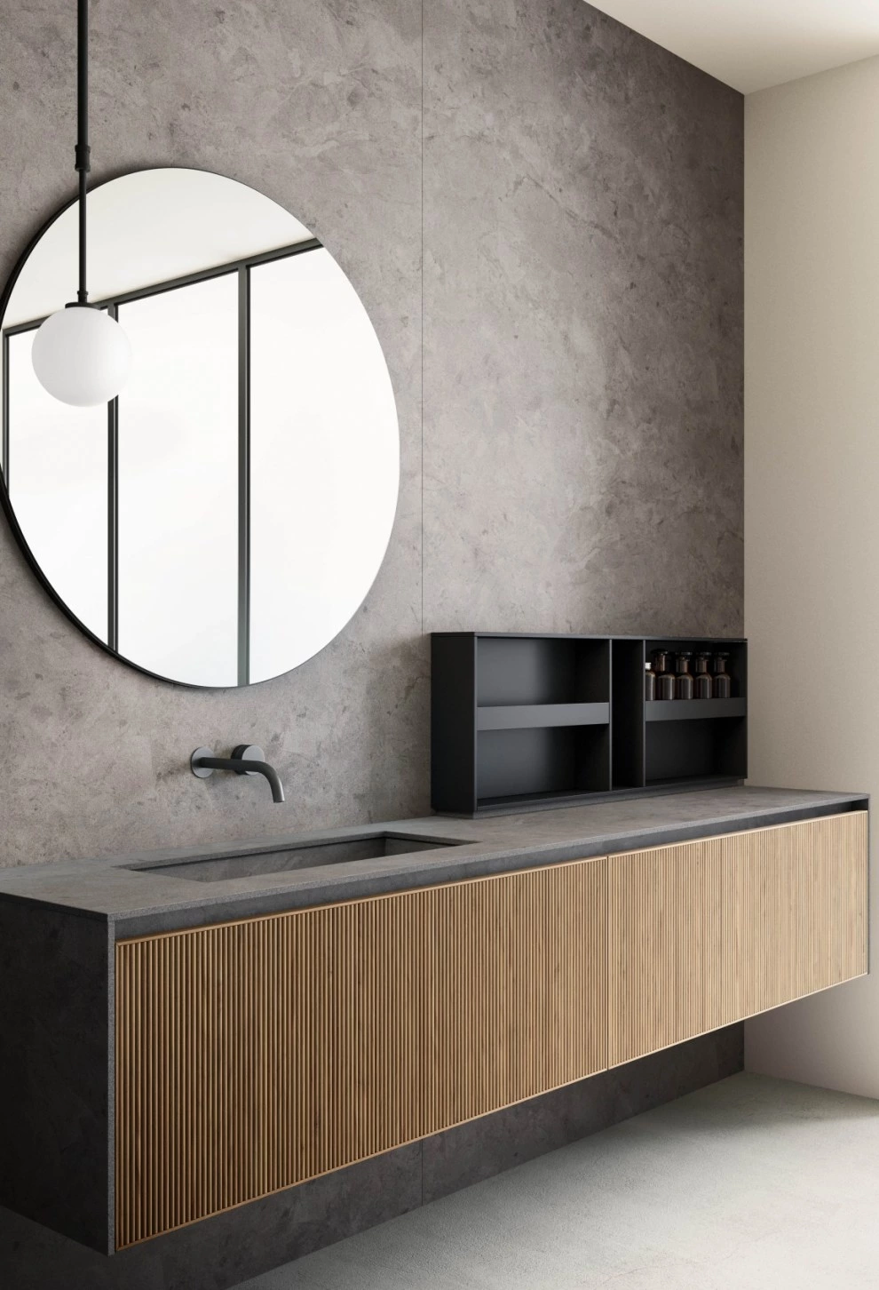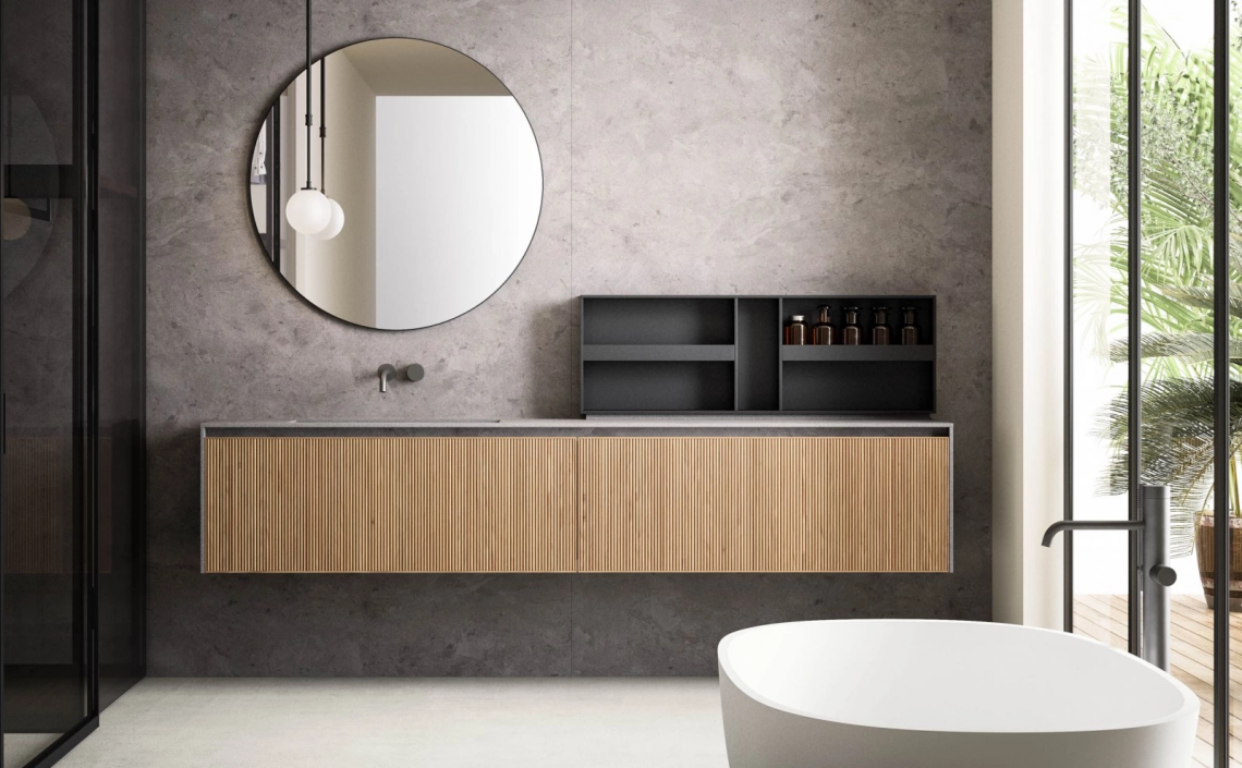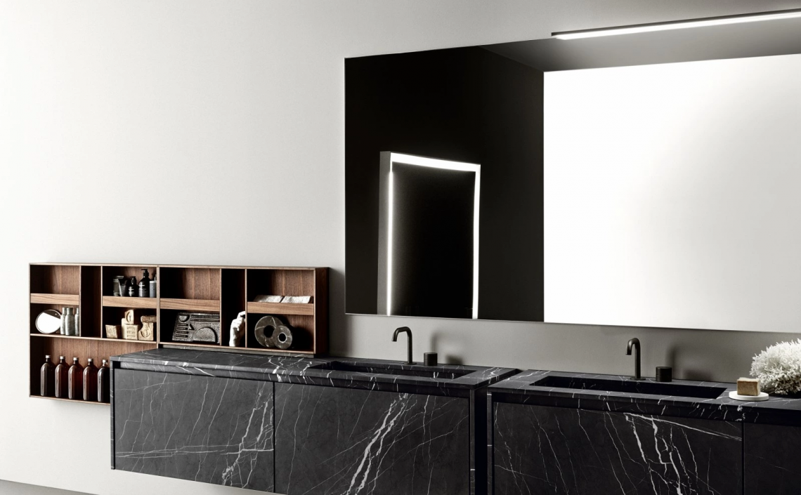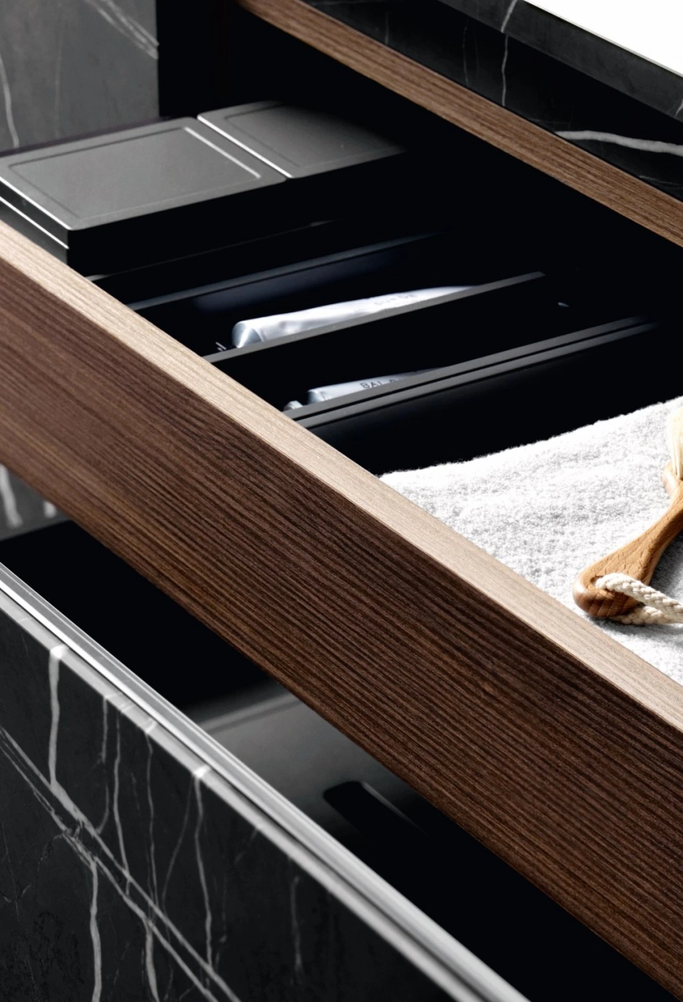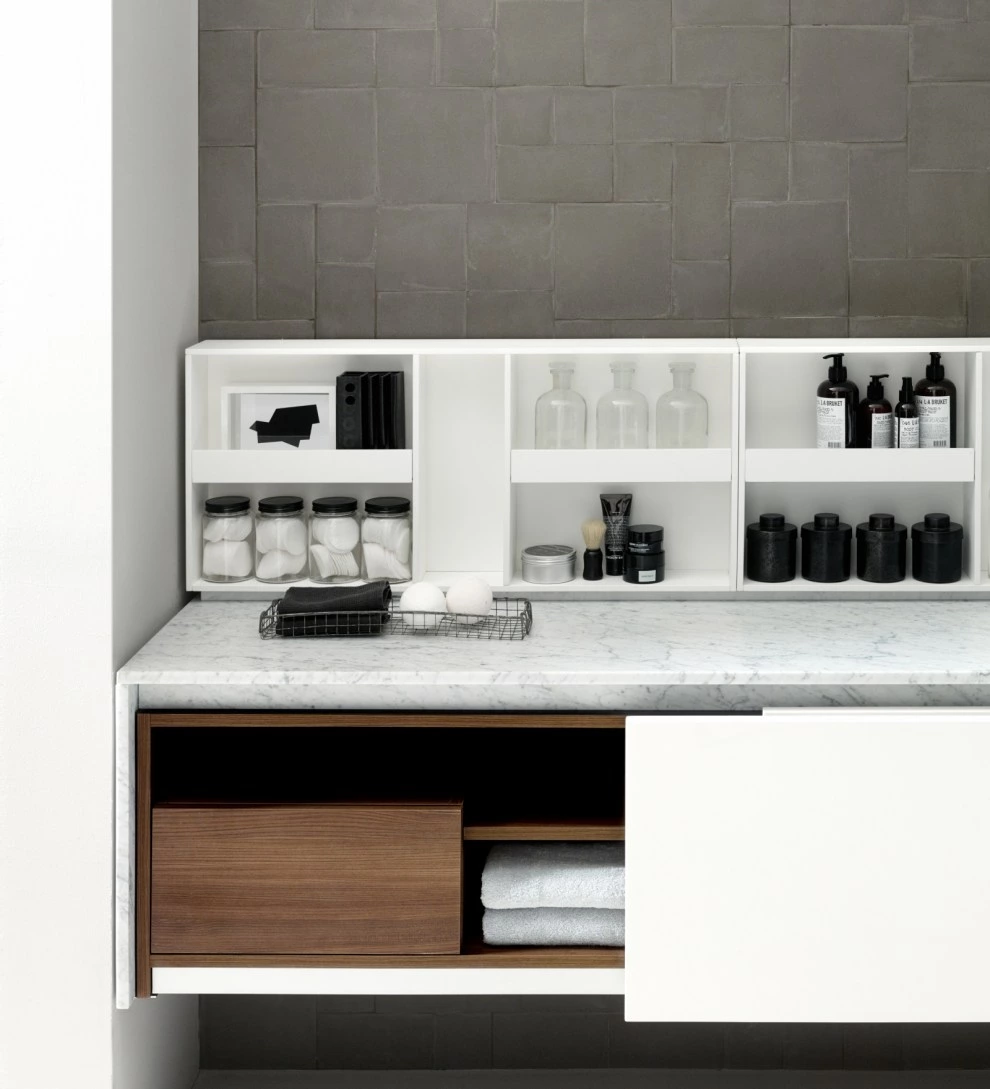 The bathroom system is now enhanced with a choice of combinations of elements, materials, colours and finishes , yet retaining its distinctive opening with coplanar sliding doors, pull-out or hinged.