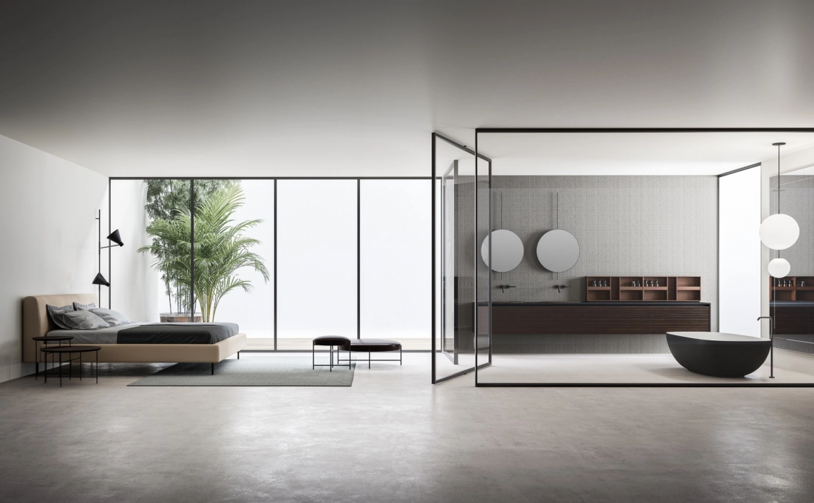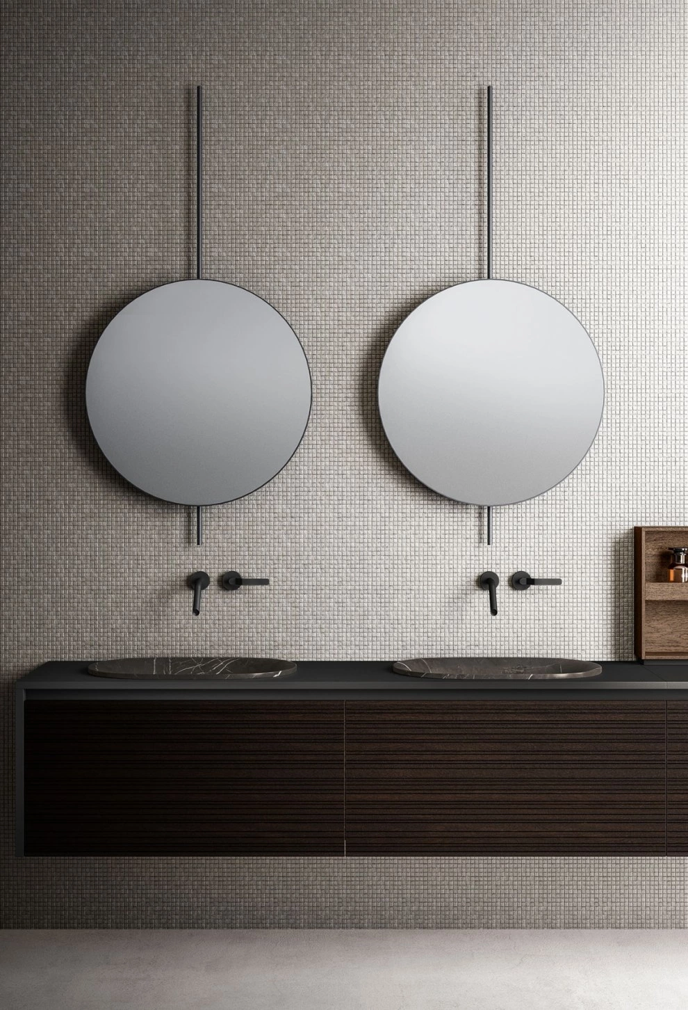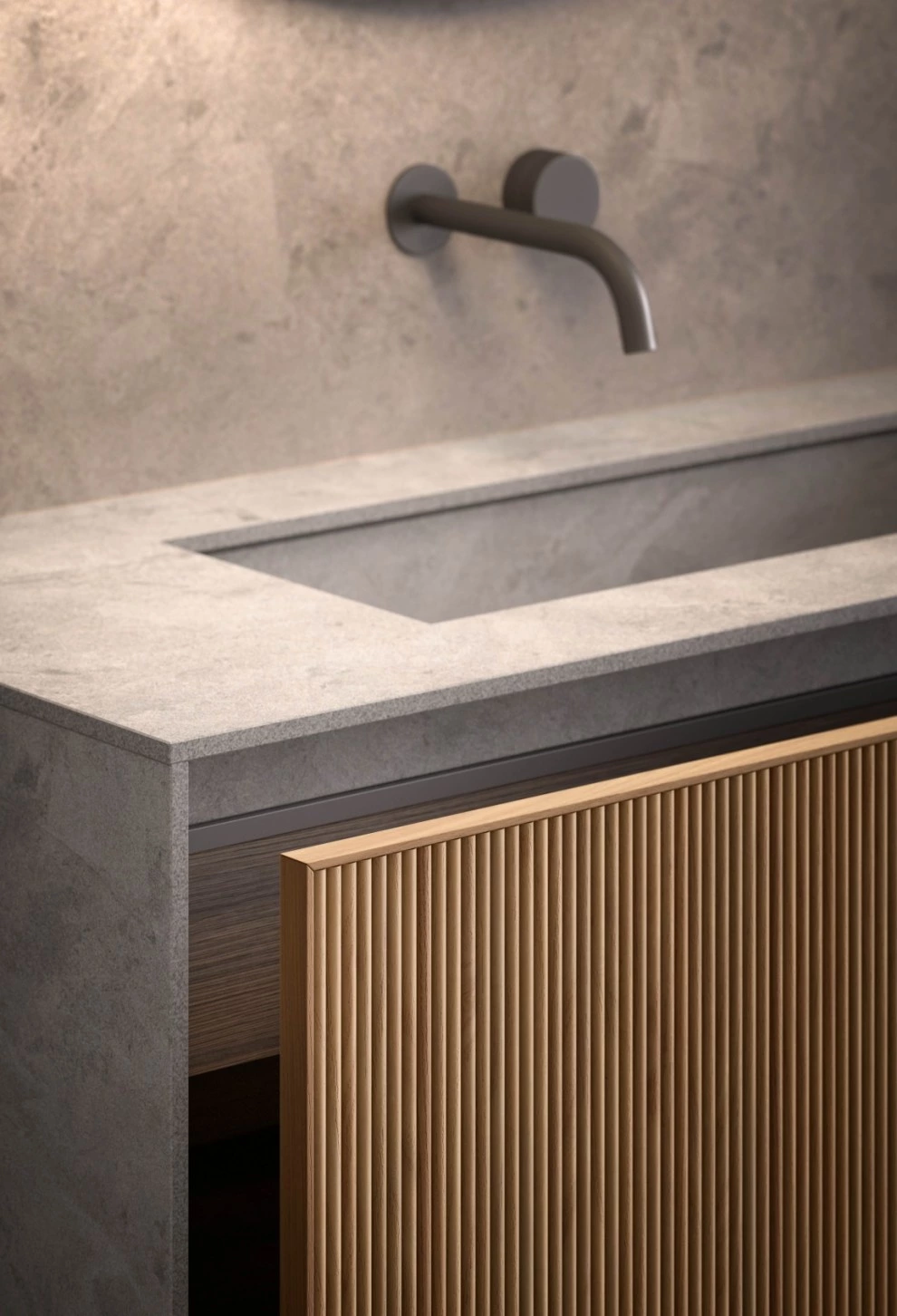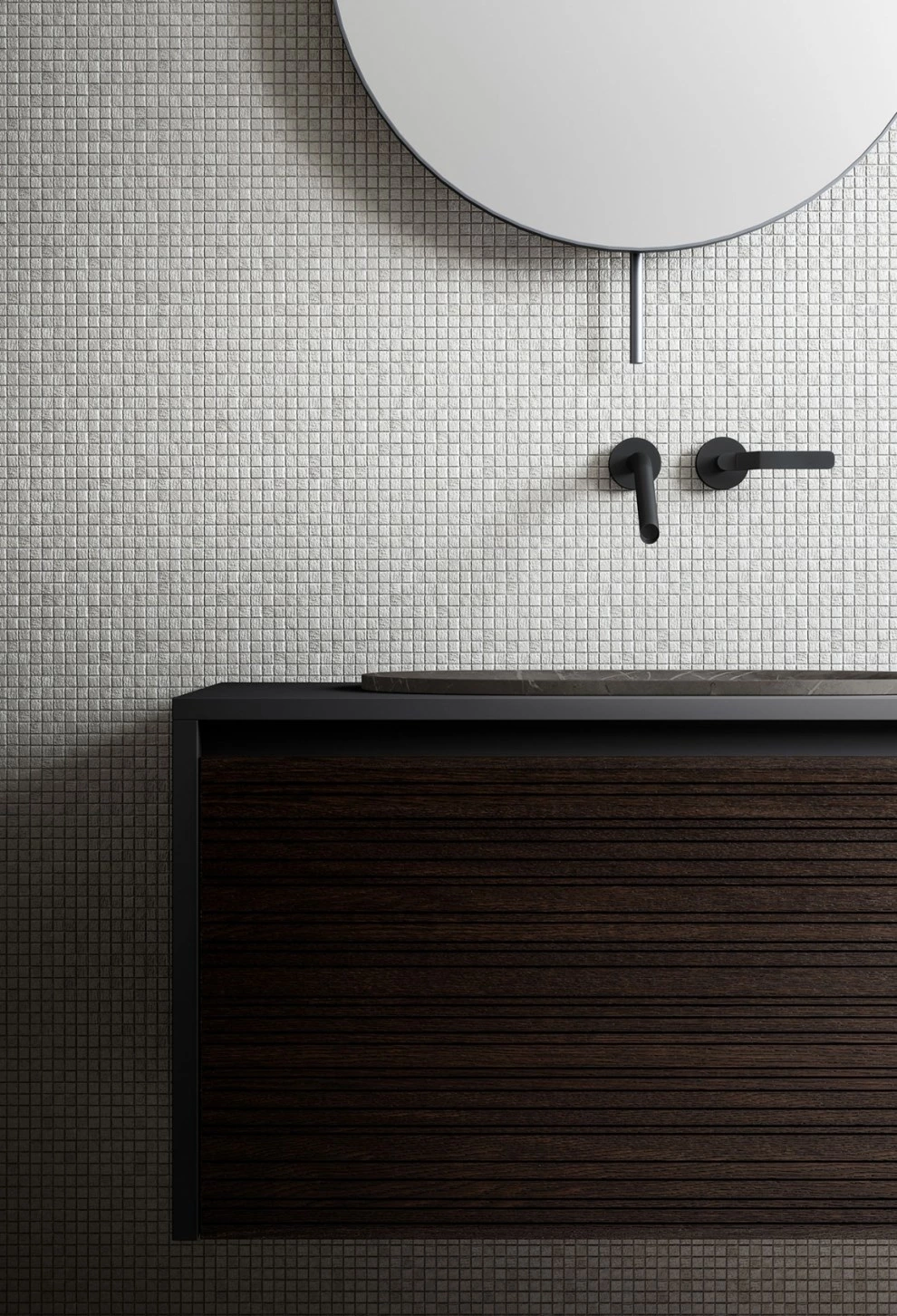 The bathroom system is now enhanced with a choice of combinations of elements, materials, colours and finishes , yet retaining its distinctive opening with coplanar sliding doors, pull-out or hinged.