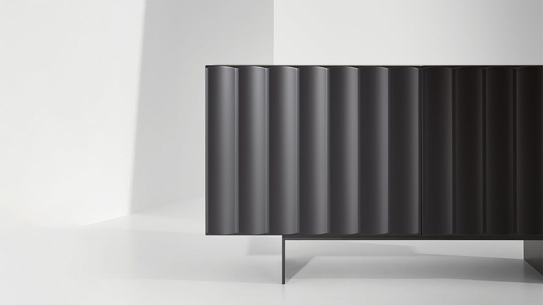 The signature feature of the Dorian contemporary sideboard is the wide vertical groove highlighted in its doors. The sense of movement thus created by the doors of the Dorian sideboard breaks up the linearity of the wall on which it rests, thus adding visual appeal to the intrinsic function of the sideboard. The doors and frame of this sideboard are made of wood, a material which adds elegance to the overall look, painted in white, bronze or lead finishes. The base is available in the version with two feet for a lighter visual effect or in the version with a plinth for a more compact look.