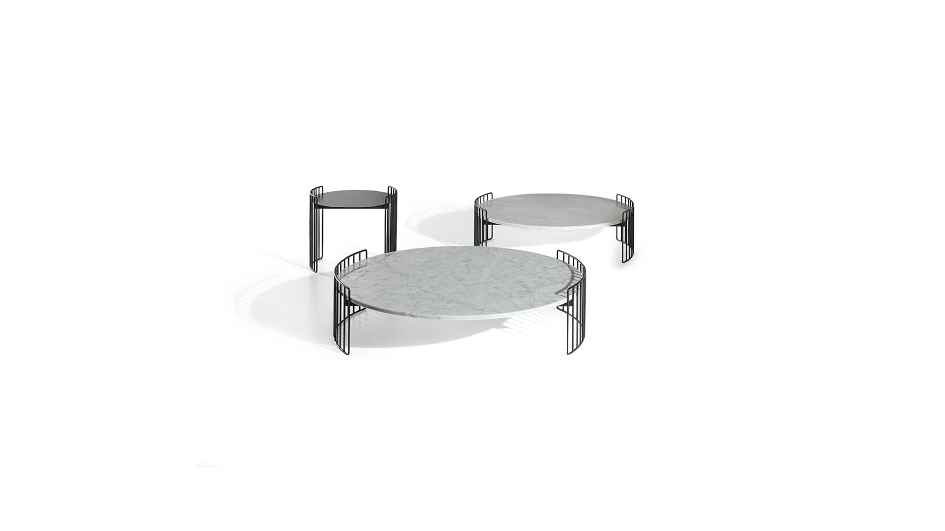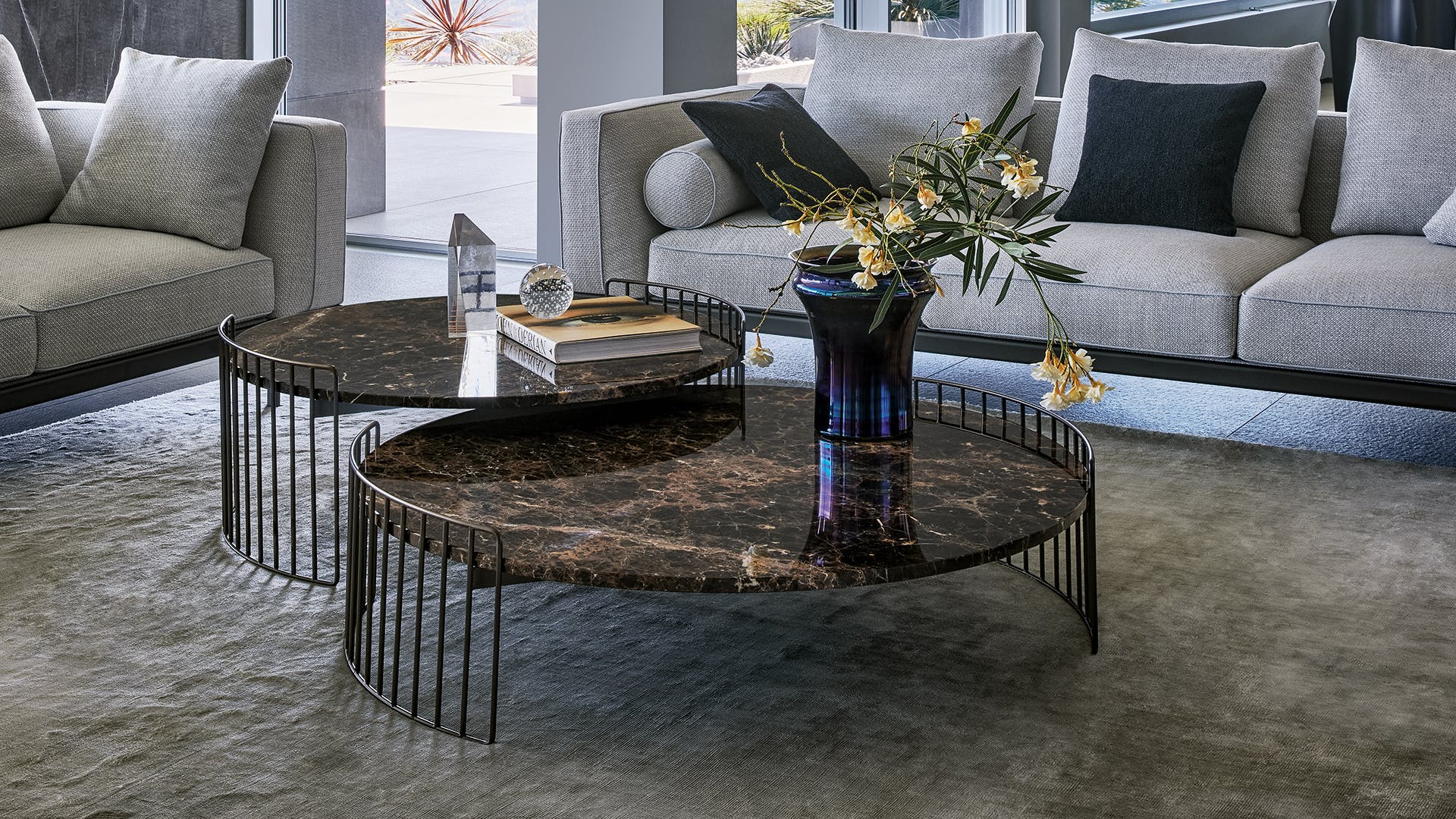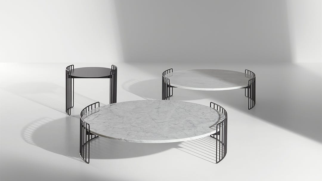Harpe coffee tables, while decorating the living room, are practical storage areas which elegantly enhance the living room on their own or in combination. The collection of Harpe coffee tables is inspired by the strings of a harp from which they take their name: the base is visually light and encircles the top, available in various materials from marble to ceramic, as well as metal and glass. With their different heights and dimensions and different available tops, the Harpe round coffee tables for living spaces can adapt to every living room, both when placed alone and when combined.