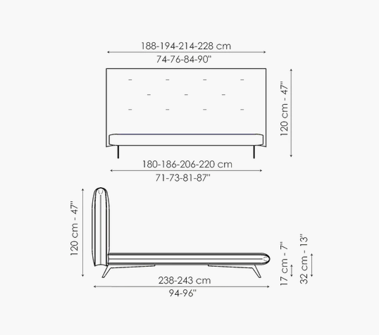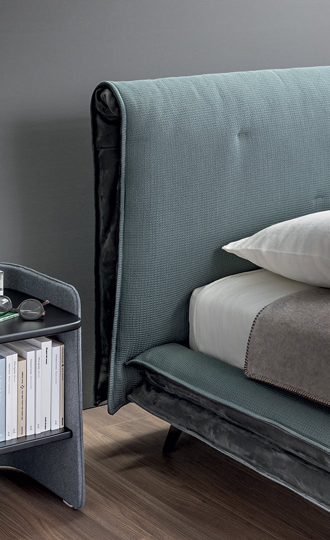 The high upholstered headboard and bed frame are the distinctive elements of the Saddle bed: folded over themselves, they bring to mind the form of a saddle, which gives the name to this family. The characteristic features of the bed’s headboard are the quilting and the valuable leather inserts which are also found in the bed frame. This allows a singular interplay of materials and combinations that create an appealing optical effect and emphasize the extreme attention to detail. The figure of the bed is made even lighter by the feet in painted metal available in numerous finishes. Alternatively, it is possible to choose among other different versions: the Saddle bed hi with an even higher headboard, the Saddle bed plus with a thicker bed frame and low feet, and the Saddle bed hi plus, which combines these two variants. The modern high headboard beds are also available with storage (Saddle bed open and Saddle bed hi open) and the collection is completed by the Saddle bench with its shaped legs.