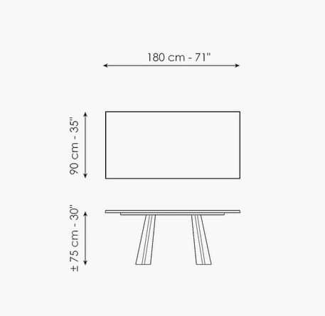 Inspired by the architecture of traditional Japanese Shinto temples, which give rise to the name “Torii”, it stands out on account of the “tectonic” qualities of the base, composed of two slightly inclined metal elements. The elegant design is completed by the rigorous top which is available in wood, ceramic or marble. The formal qualities of this elegant dining table designed by Marconato & Zappa emerge forcefully in the version which offers a single-material finish both for the top and the decorative inserts of the legs.