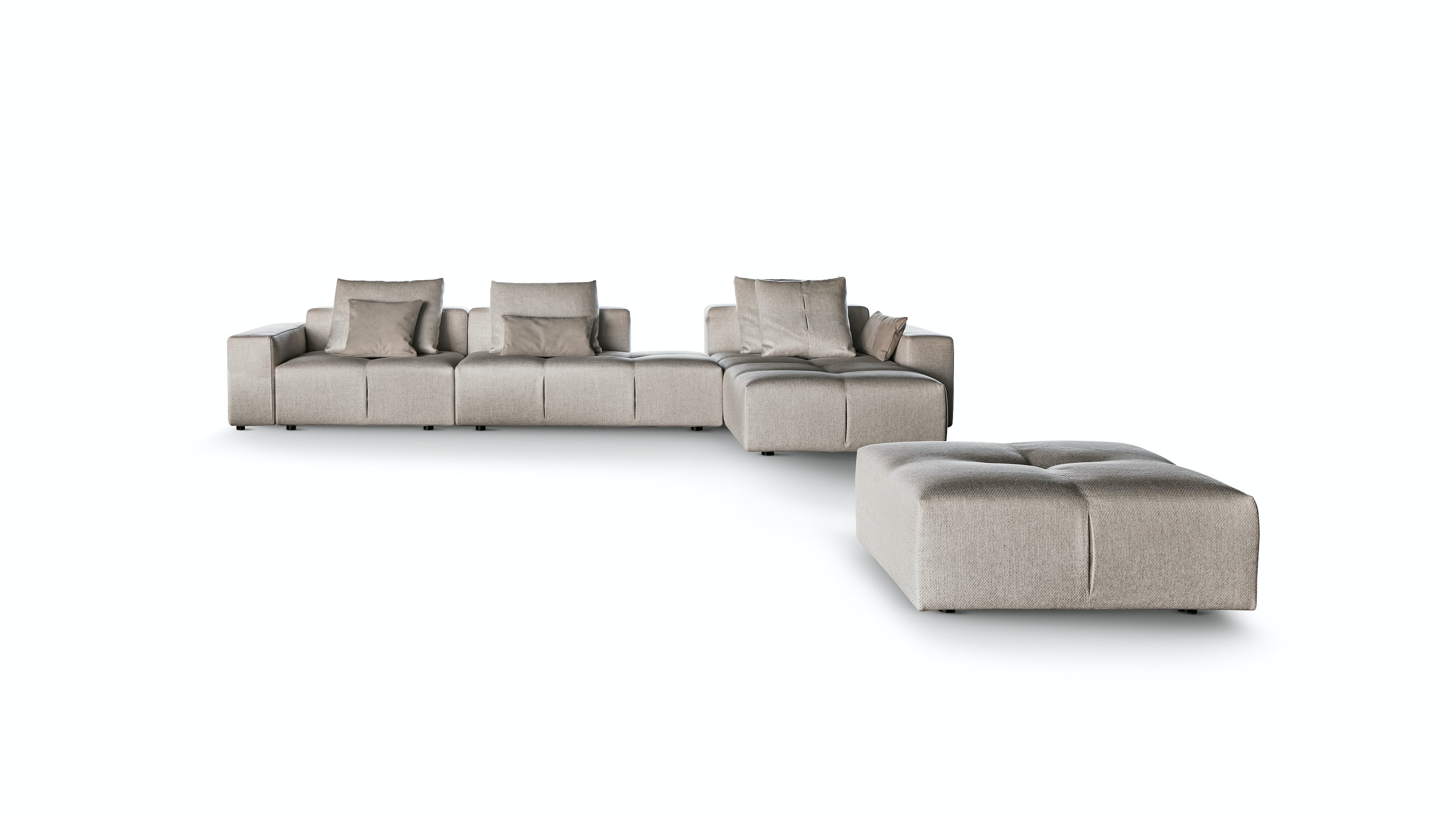 The natural union of all the elements in this collection of sofas gives rise to the harmonious atmosphere and the social appeal of the Seventies, in a language of timeless geometric purity. The Bonamour contemporary sofa is a system of seats, armrests and backrests with an essential and distinctly contemporary morphology. The modules, of various rectangular forms, can be integrated to create combinations of both linear and angular volumes. The rigorousness of the volumes, the reassuringly formal and architectural expression, is this collection’s stylistic “monogram”, whilst the sartorial attention – marked by pleats which punctuate the different geometries – is the expression of real values, achieved through high standards of handcrafted quality.