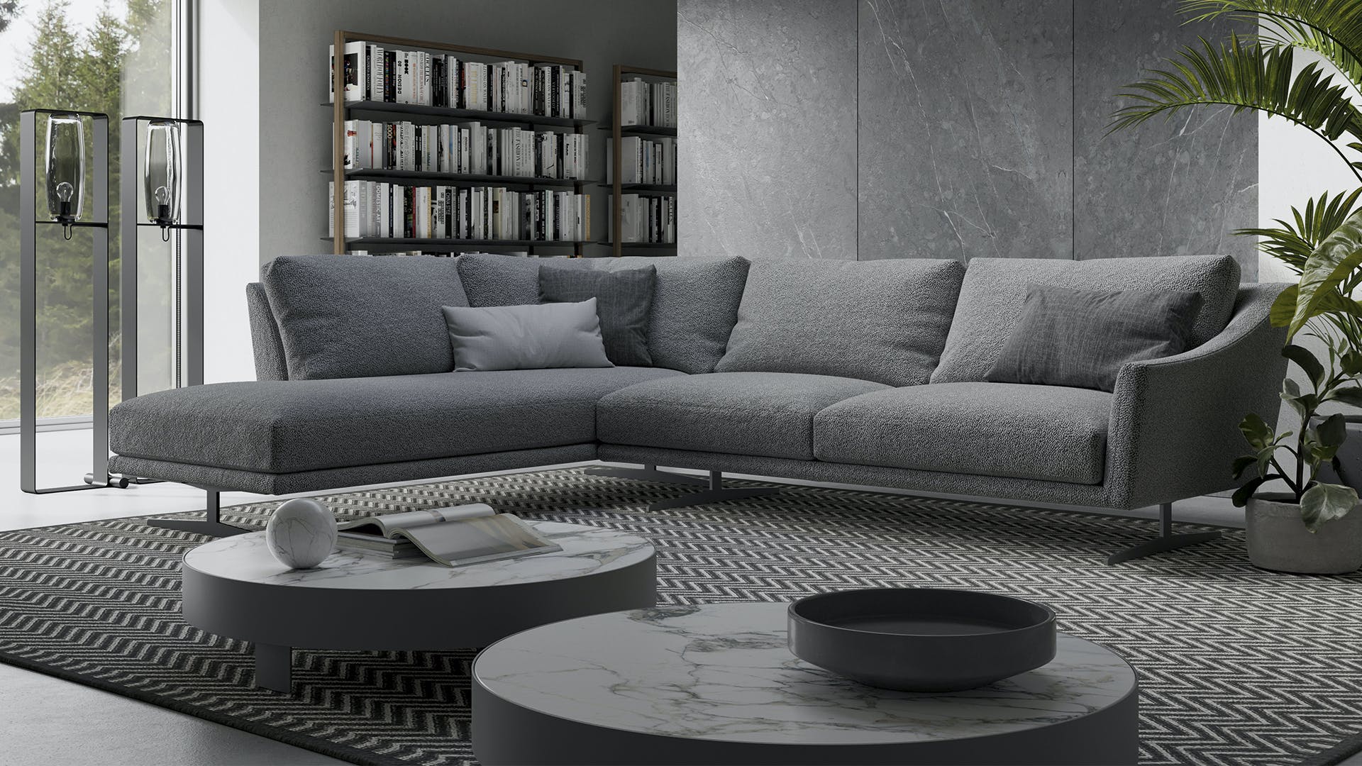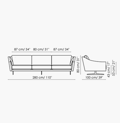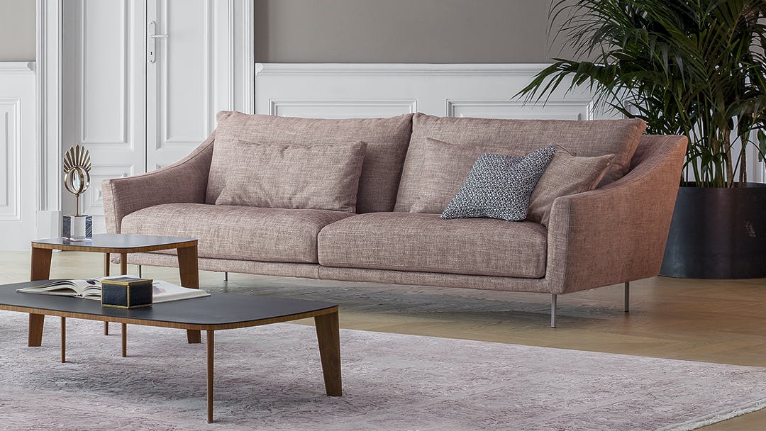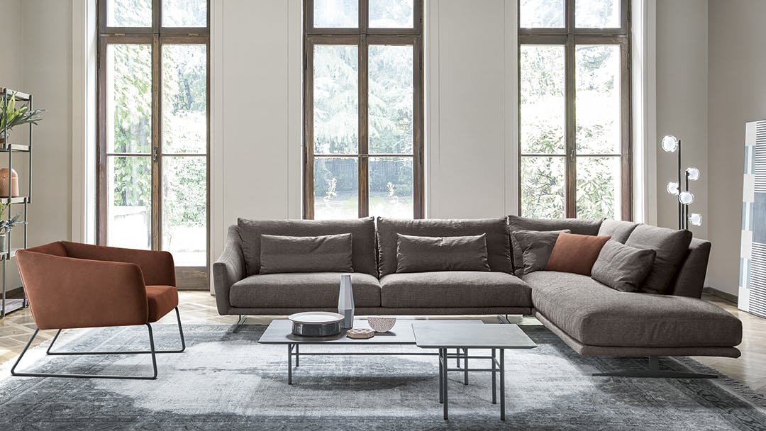 Skid is an elegant sectional sofa for living rooms characterized by soft back cushions and a delicate inclination of the armrests, a characteristic that lightens the overall appearance. The lightness is further enhanced by the particular conformation of the body, that is suspended from the floor thanks to a base in painted metal, available in two different forms: straight feet or bobsleigh-shaped base. The purity of the lines makes Skid suitable both for environments with a contemporary style and those of a more classic taste. In addition to the linear sofa, it is possible to create solutions with chaise longue or corners, combining poufs or opting for more creative compositions, meeting the widest variety of functional needs. The upholstery, in fabric or leather, is fully removable.