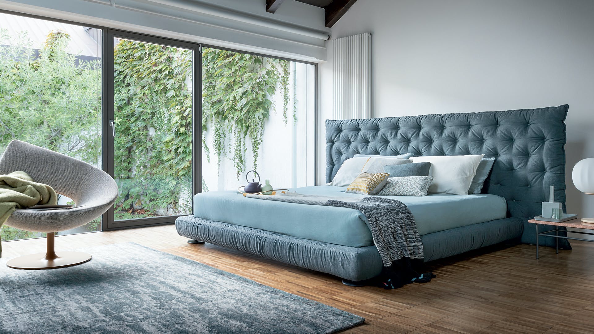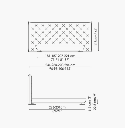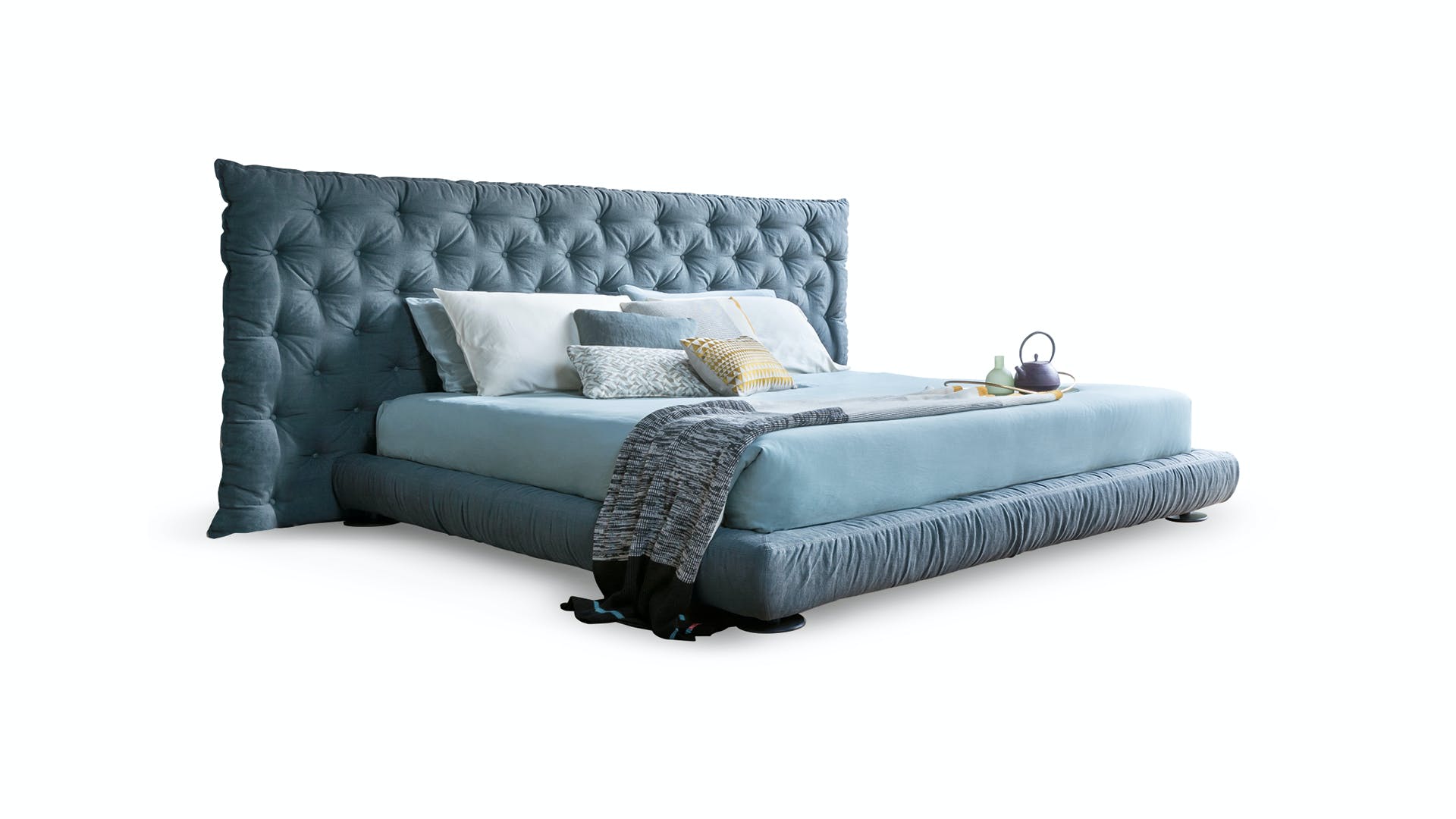 Full Moon is a double design bed with an opulent headboard that, with its sophisticated capitonné padding, frames the bed and provides a sense of abundance and softness, underlined by the draped bed frame. The version with the higher headboard (Full Moon hi) is also available with storage space (Full Moon hi open), which provides additional space for storing covers, cushions and everything necessary for the bedroom. Additional distinctive details are the painted metal circular feet, available in a series of colour variations. This bed, the name of which recalls the night, and specifically an evocative full moon, is the perfect companion for encouraging the sweetest and most relaxing dreams.