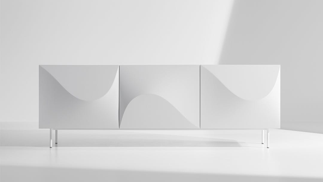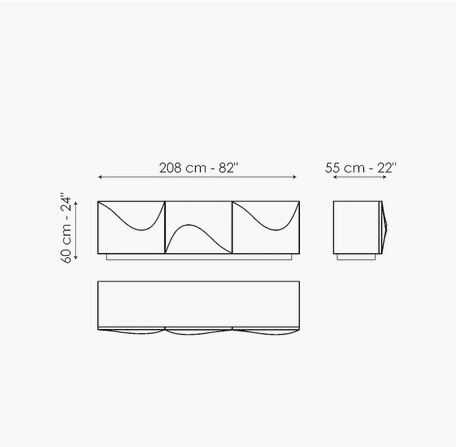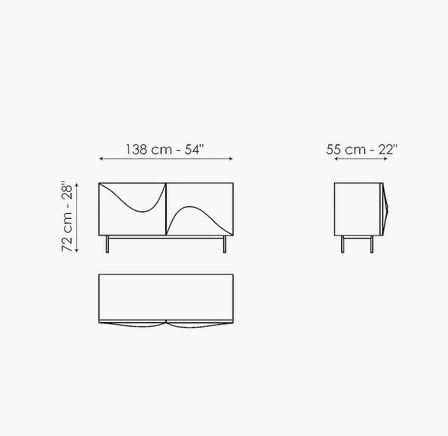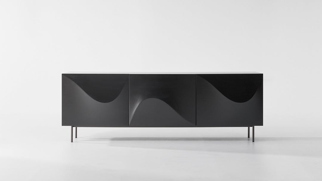 Inspired by the poster for Alfred Hitchcock’s film of the same name, the Vertigo design sideboard is distinguished by the soft wave that characterizes the front doors, creating a flow of movement on the surface that softens the rigorous design of the unit. The metal base consists of four seemingly slender feet that give the entire unit a sense of lightness. The Vertigo sideboard is available in three different colour combinations: white lacquered wood outer frame, white lacquered structural polyurethane doors, white metal base or matt bronze lacquered wood outer frame, bronze lacquered structural polyurethane doors, bronze metal base or matt lead lacquered wood outer frame, lead lacquered structural polyurethane doors, lead metal base.
