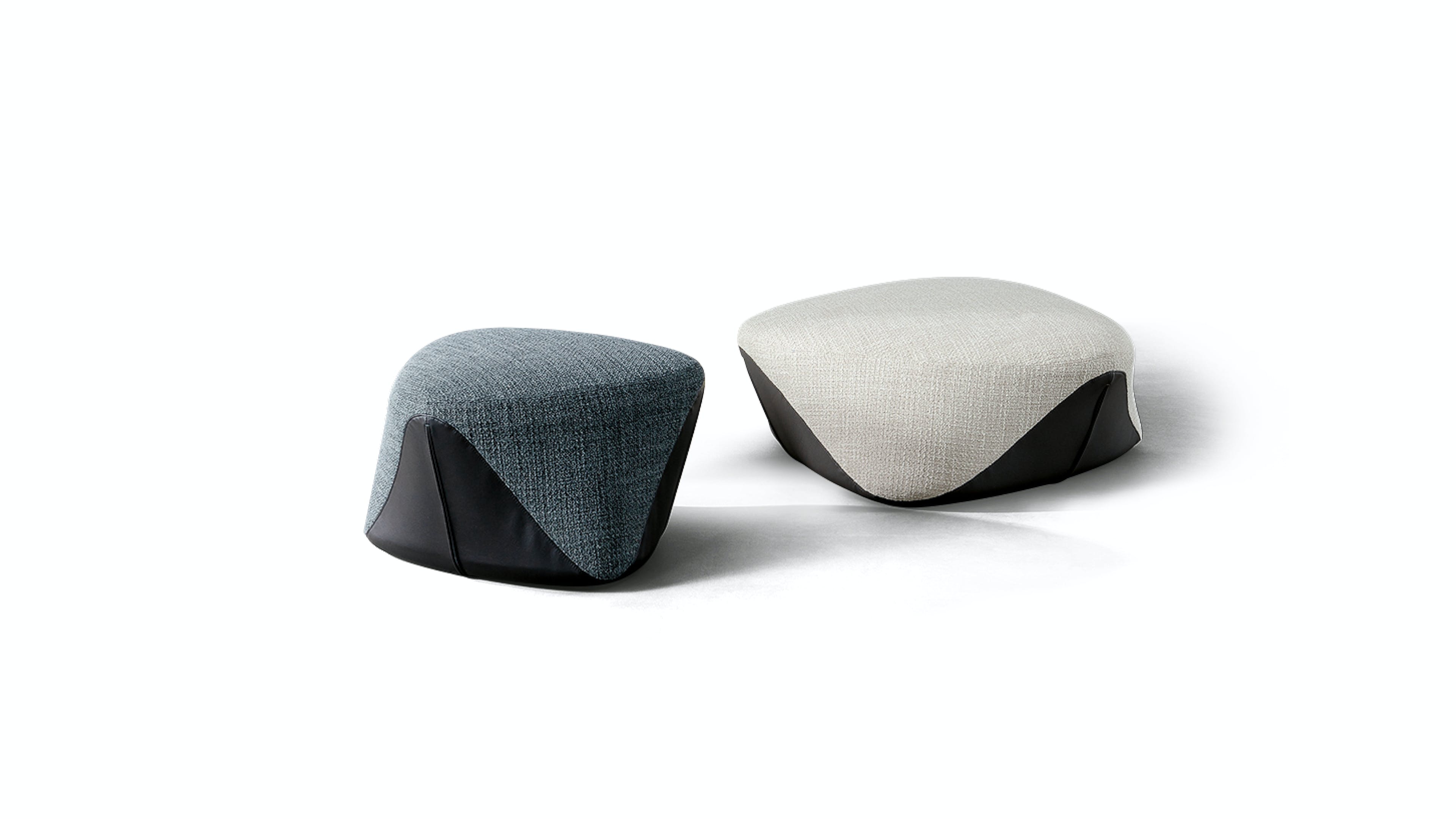 The Seki modern floor poufs, reminiscent of stones polished by the wind and rain, create a sculptural, eye-catching shape which fits seamlessly into any space. Due to the absence of edges and right angles their seemingly irregular frame takes on different shapes depending on the angle from which they are observed. The cover, divided in half by a curved line, makes it possible to play with different materials: the lower part, in contact with the floor, recalls the shoreline, while the upper part reproduces the shape and faces of the stone. The Seki poufs are available in two sizes and can be upholstered in fabric or leather; it is also possible to choose the version with covers in two different colours or materials.