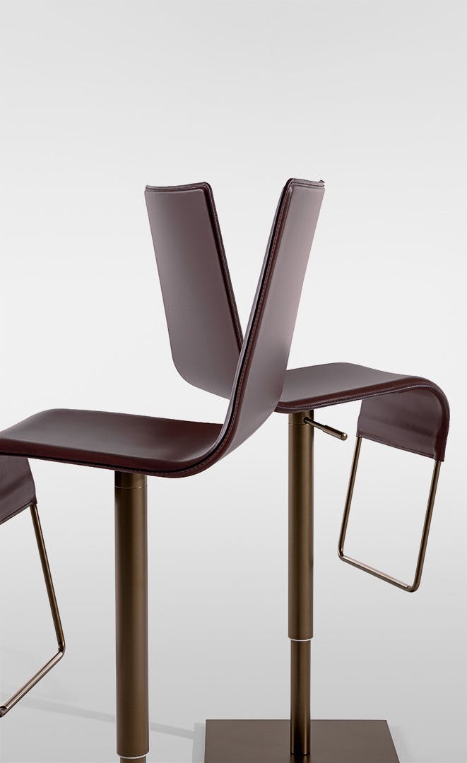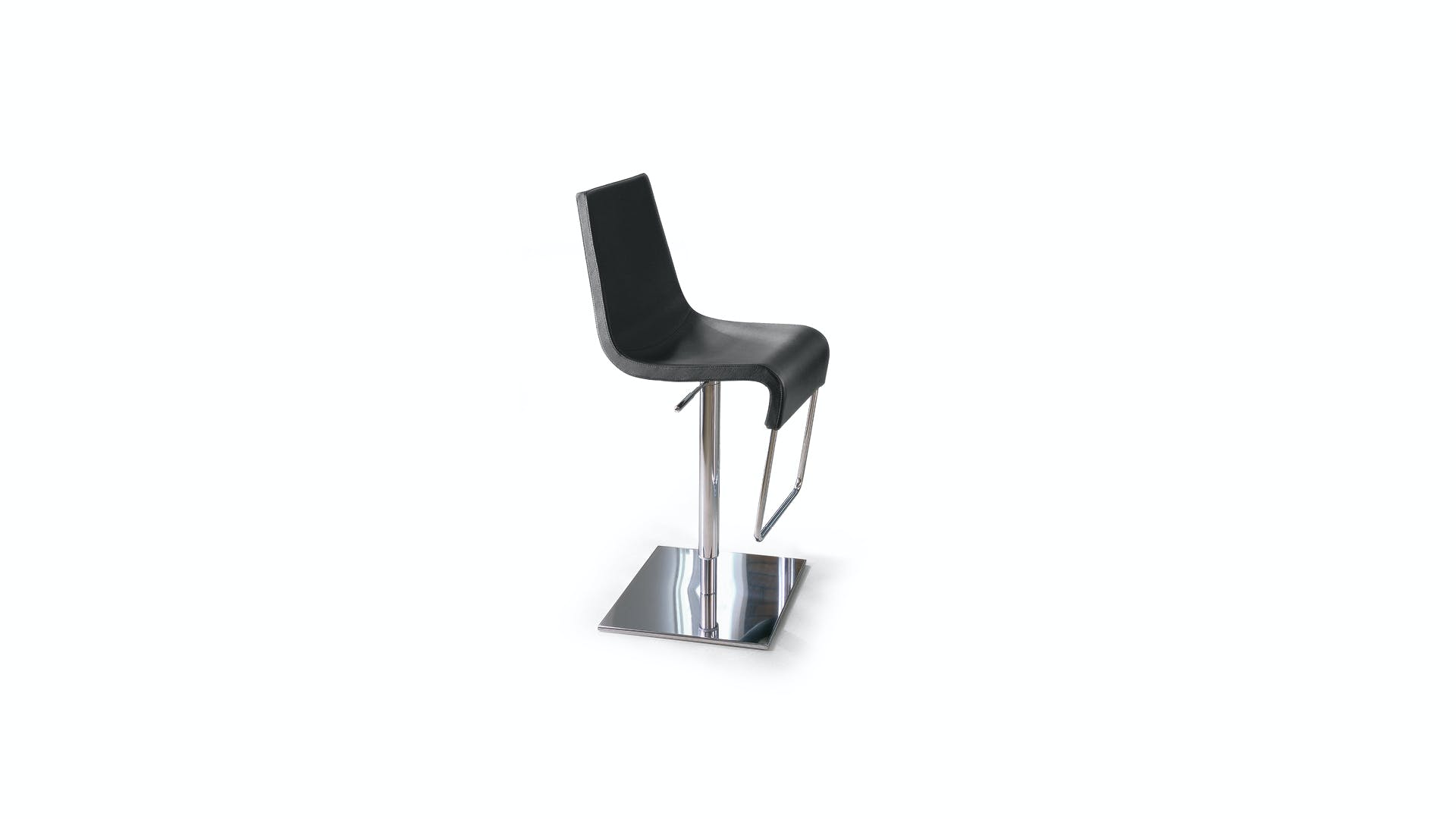 Skipping is a swivel stool with backrest that offers an adjustable height thanks to a robust piston mechanism. Available with upholstery in eco-leather, leather or emery-leather, it is particularly comfortable thanks to the sinuous shapes of the seat, with cold foamed polyurethane padding. The structure and the footrest are made of matt painted metal or chrome-plated steel. With its understated, curvilinear but minimalist line and design by Karim Rashid, Skipping is welcoming and comfortable and integrates perfectly within original environments, characterised by sophisticated atmospheres. A flexible, extremely pure and contemporary sign: an original and fascinating object that as the dominant character in any space with its agile and dynamic presence, appears comfortable and inviting right from the first glance.