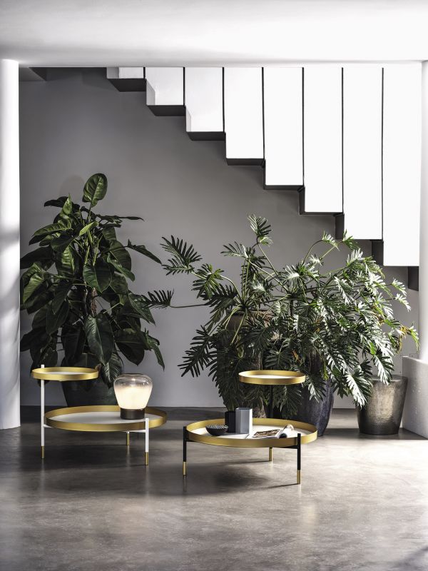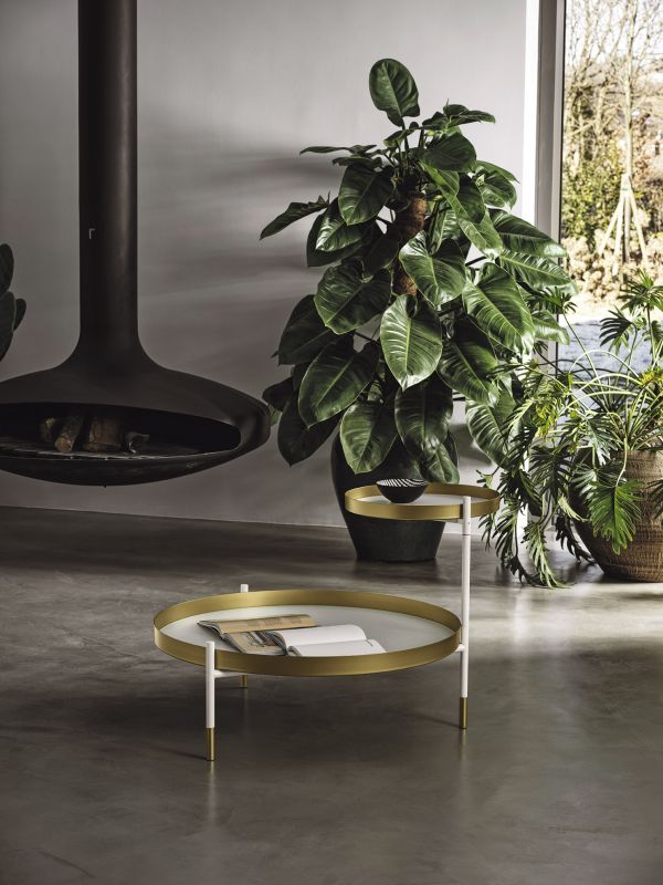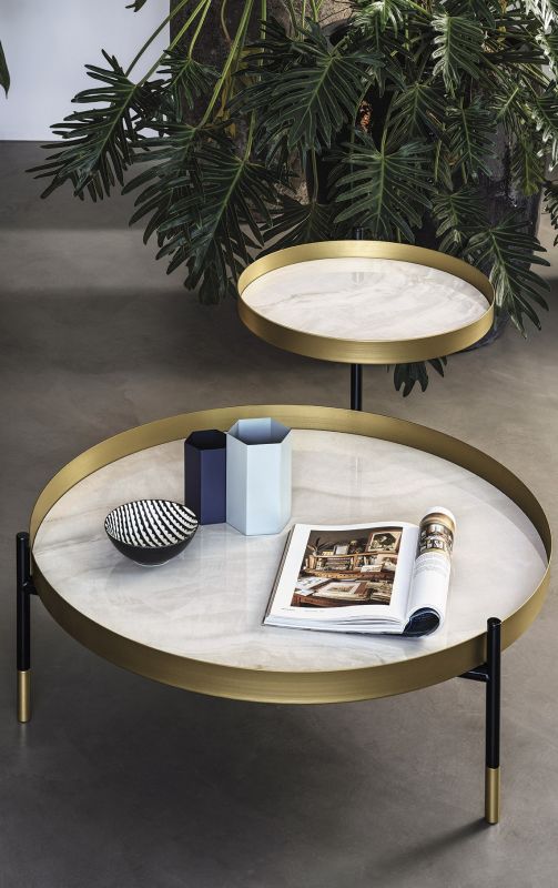 Coffee table with lacquered Metal frame. Decorative details (feet and frame) in lacquered Metal frame. Adjustable upper and lower top in glossy glass, Velvet matt anti-scratch glass and SuperMarble.