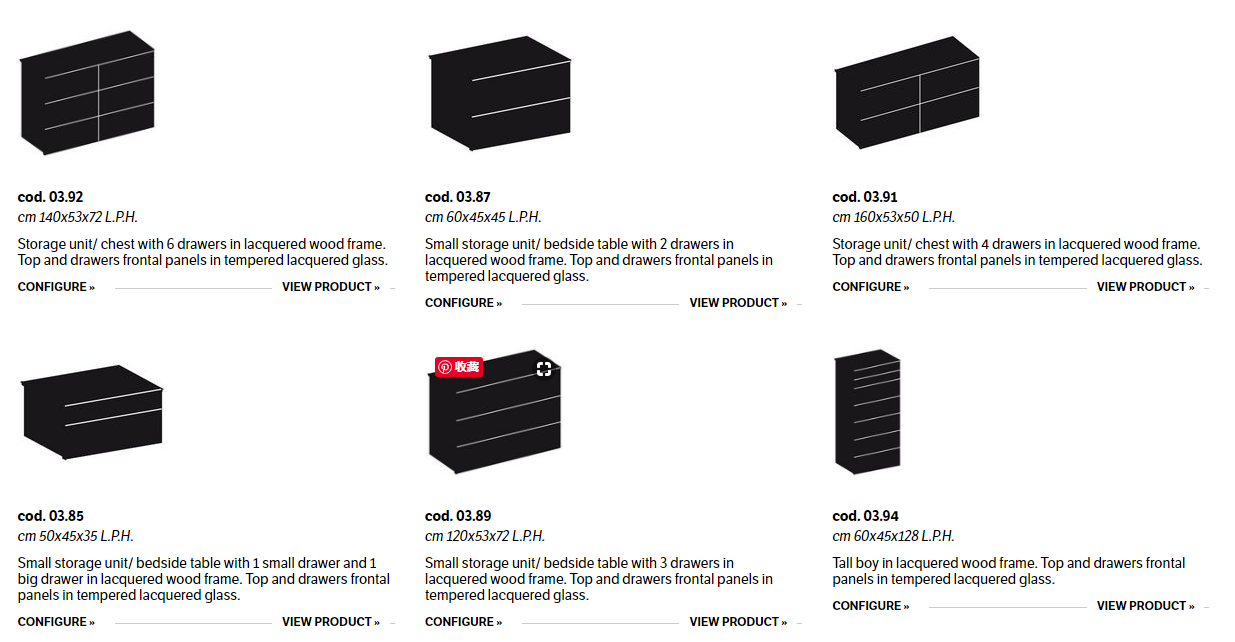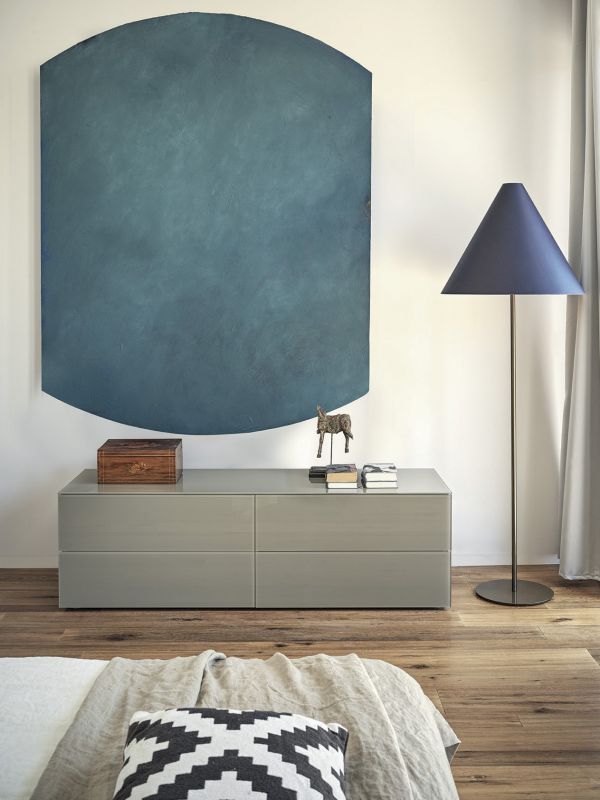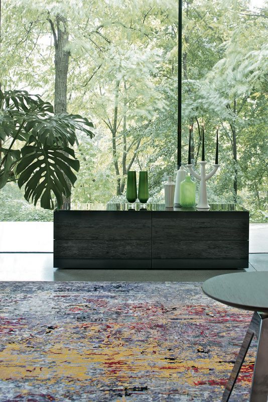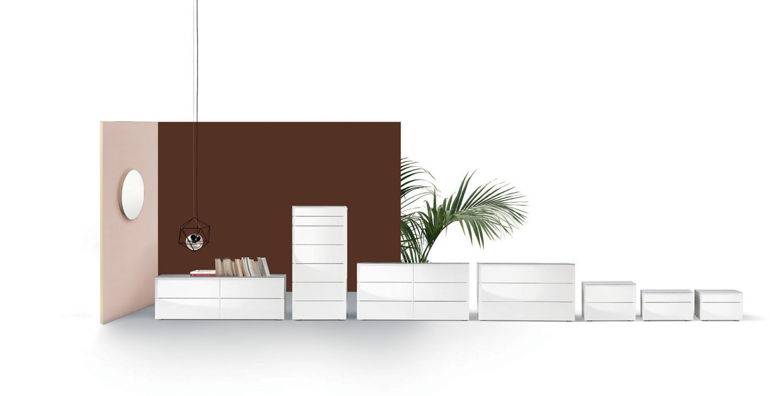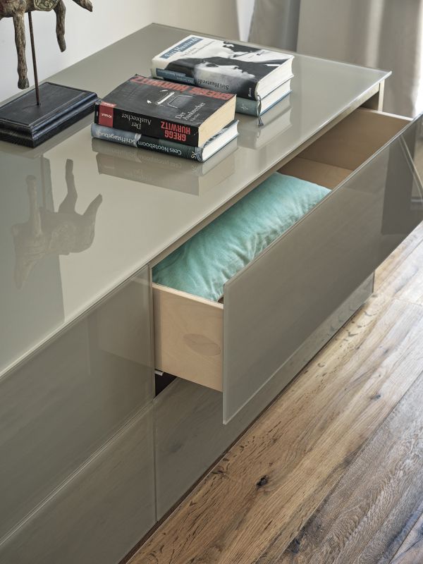 Storage collection, storage unit and tall boy in matt lacquered wood, top and drawer's frontal panels in glossy lacquered glass.