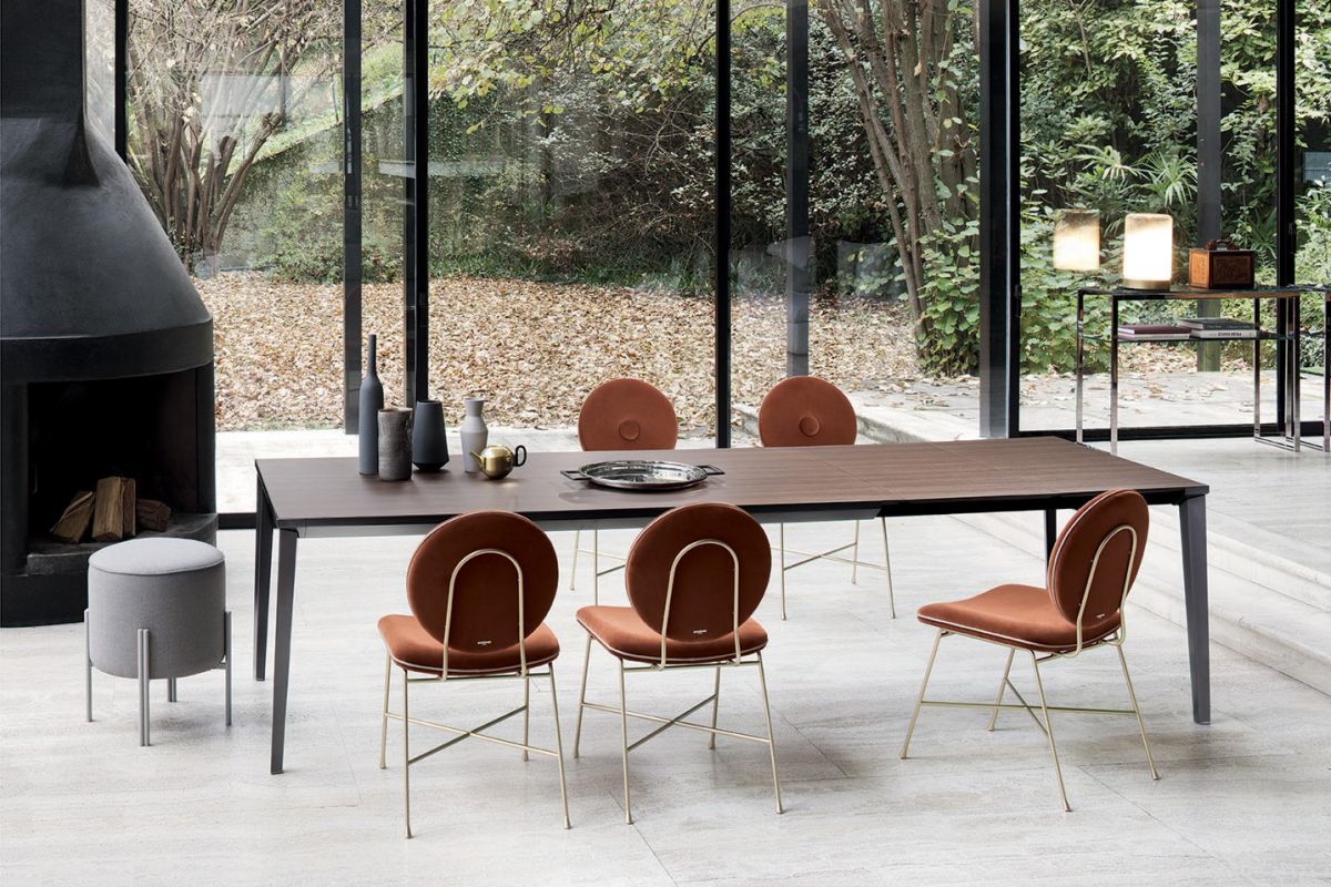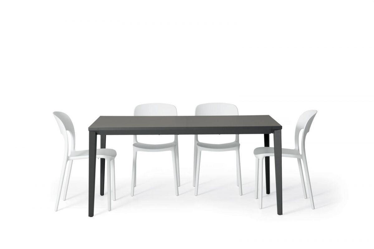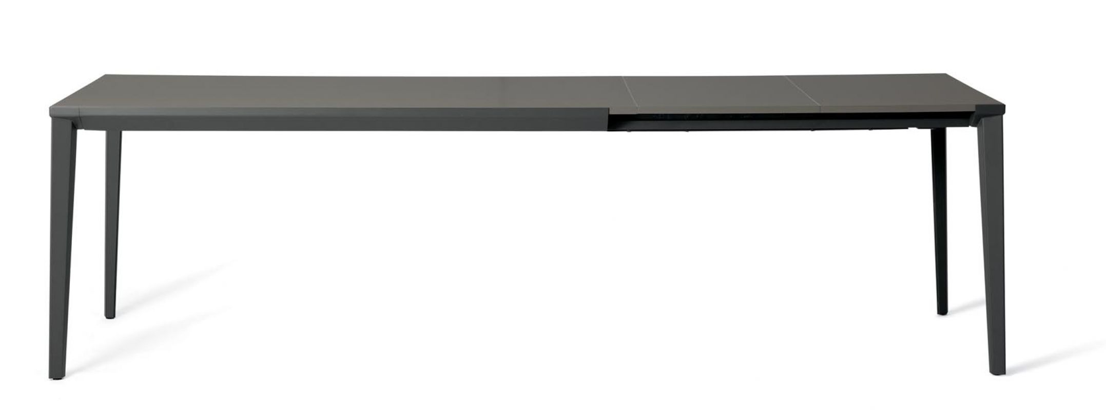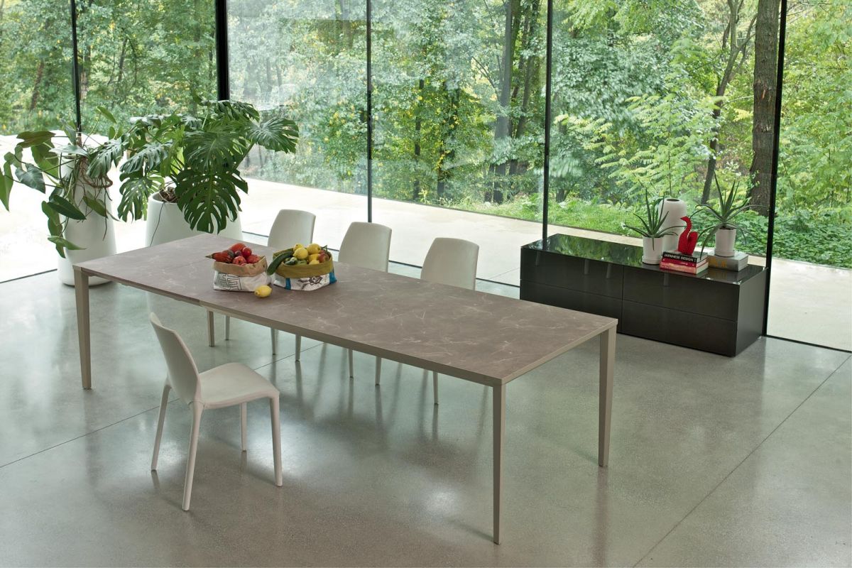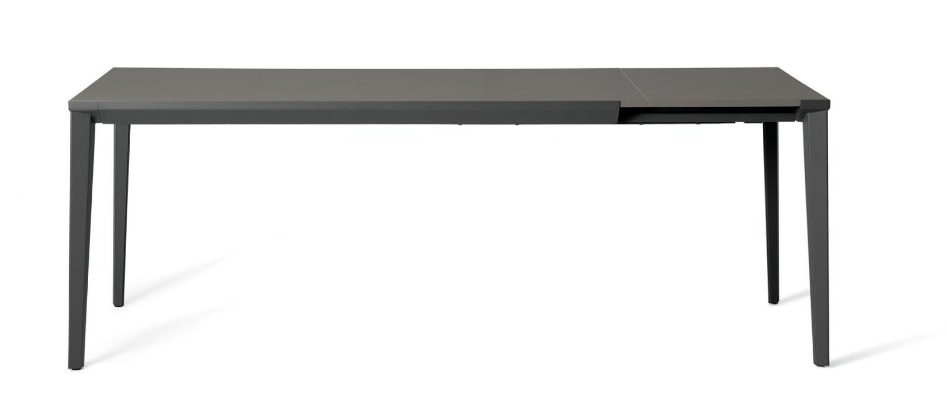 Extending table with stainless Metal frame. Top in melamine, laminate Fenix, Anti-scratch Unicolor, veneer, glossy Glass, velvet matt Anti-scratch Glass, SuperCeramic and SuperMarble.