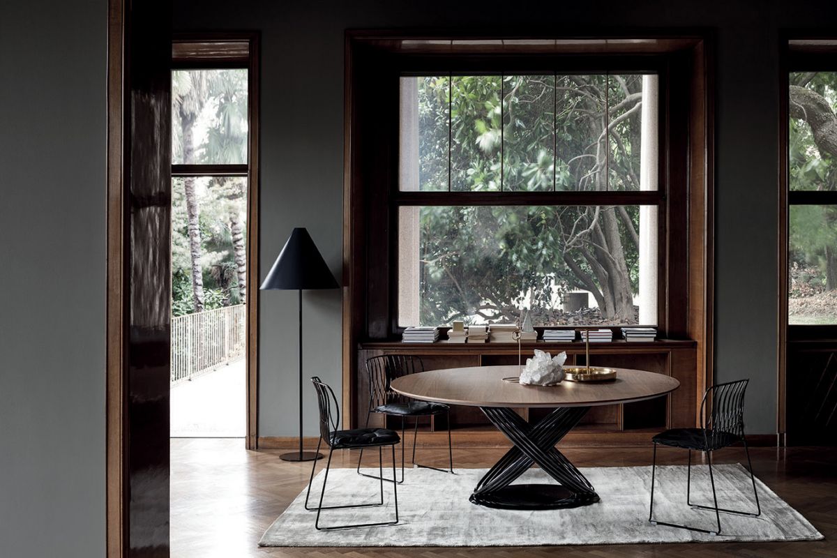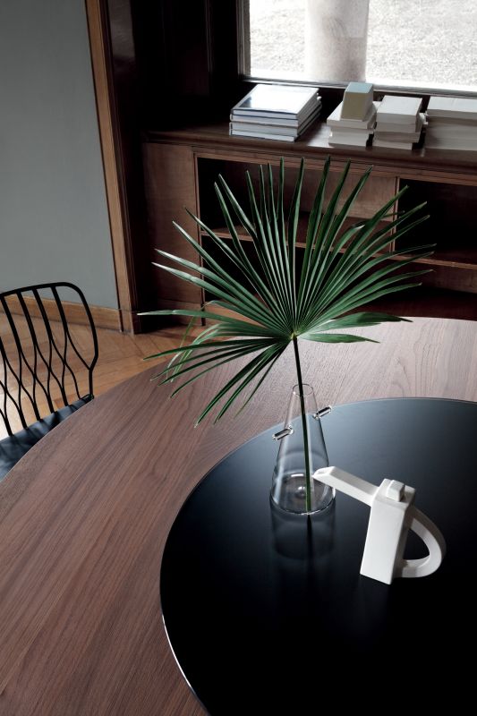 Round fix table with metal lacquered frame. Base in lacquered metal, veneer wood or SuperMarble. Top in veneer wood, glass, velvet matt-anti scratch glass or SuperMarble.